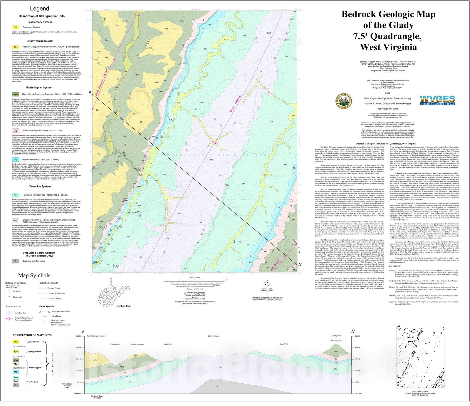 Map : Bedrock Geologic Map of the Glady 7.5' Quadrangle, West Virginia, 2012 Cartography Wall Art :