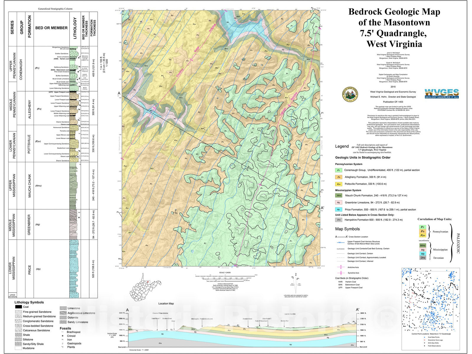 Map : Bedrock Geologic Map of the Masontown 7.5' Quadrangle, West Virginia, 2015 Cartography Wall Art :