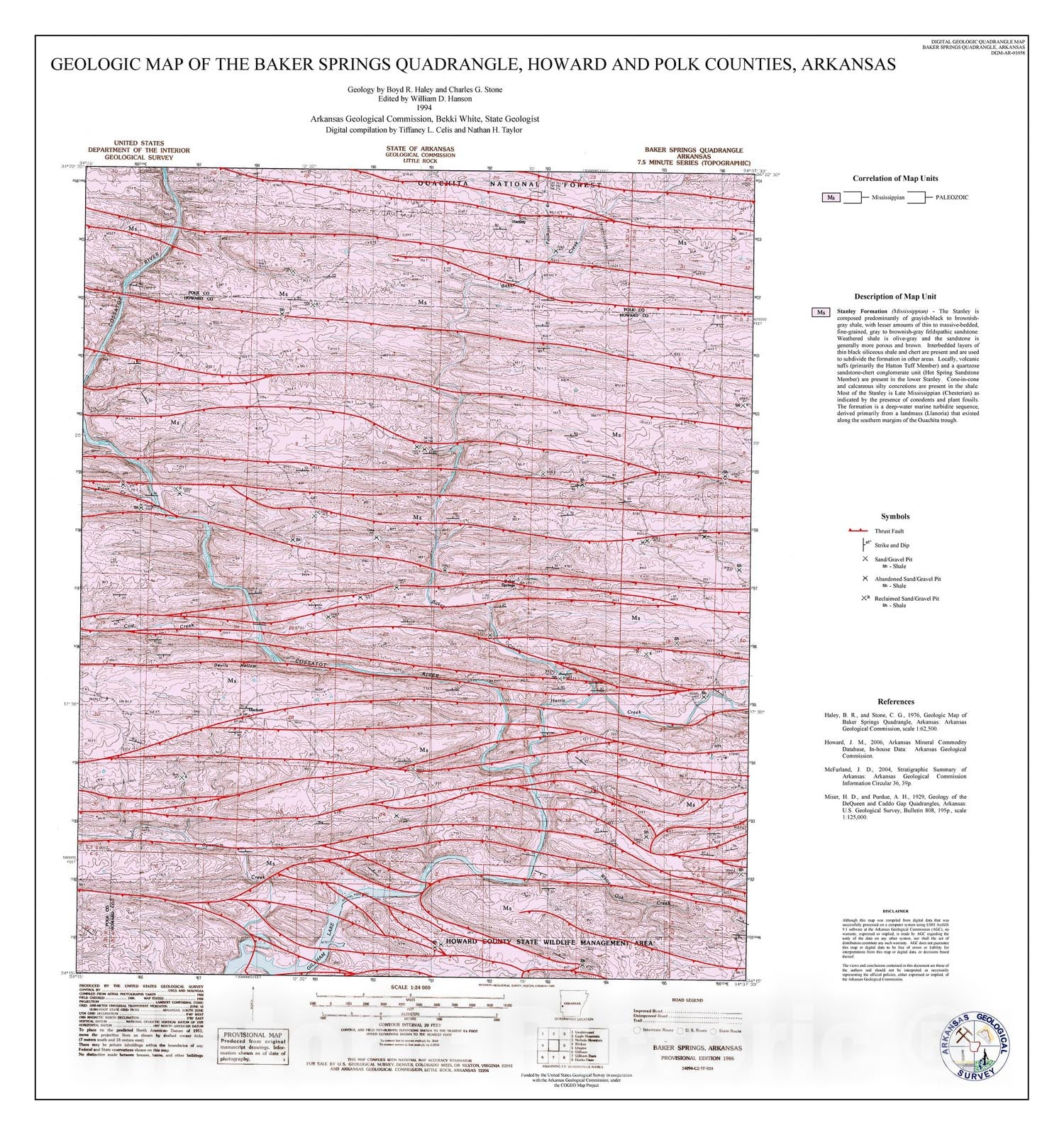 Map : Geologic map of the Baker Springs Quadrangle, Howard and Polk counties, Arkansas, 1994 Cartography Wall Art :