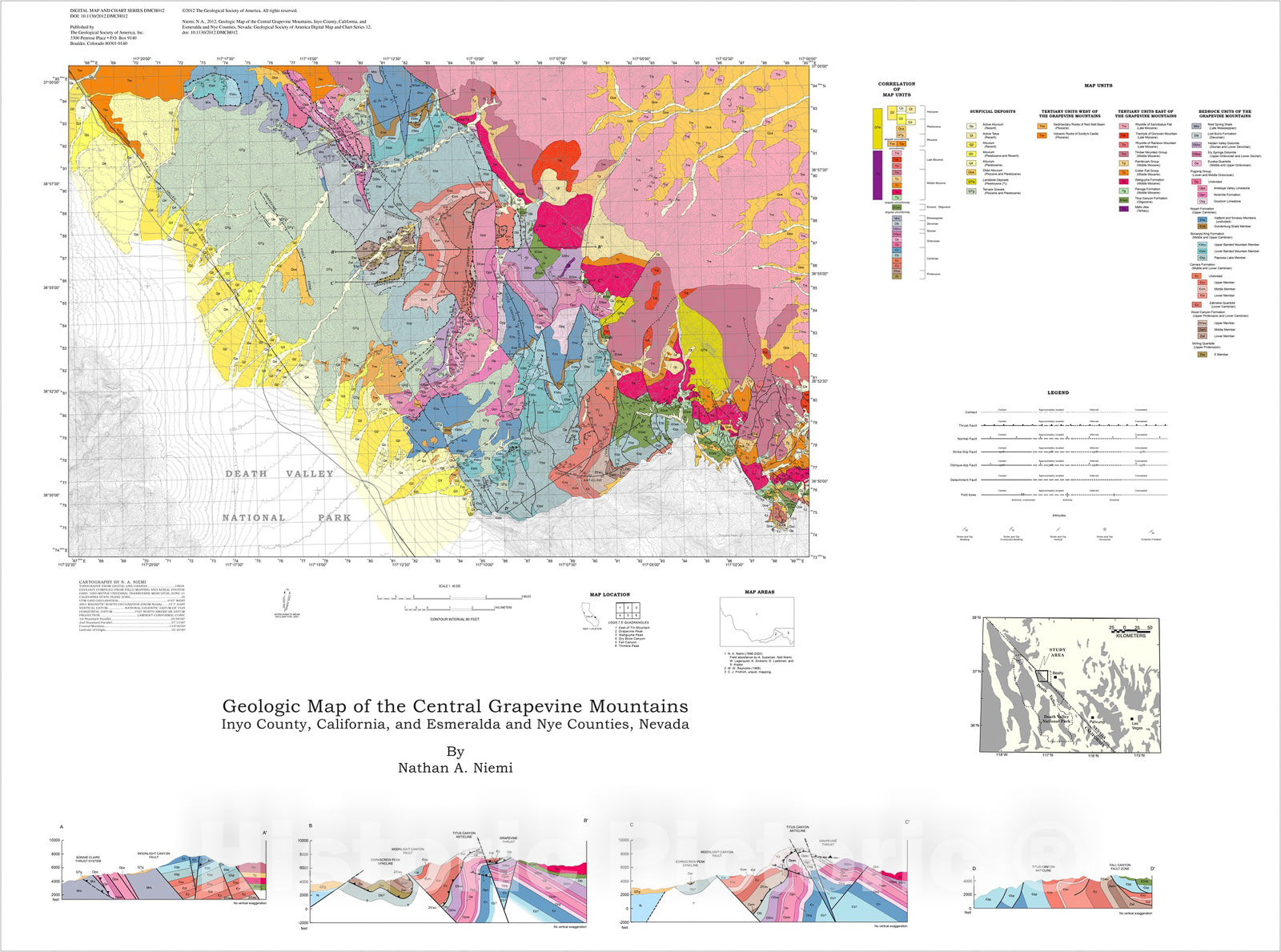 Map : Geologic map of the central Grapevine Mountains, Inyo County, California, and Esmeralda and Nye Counties, Nevada, 2012 Cartography Wall Art :