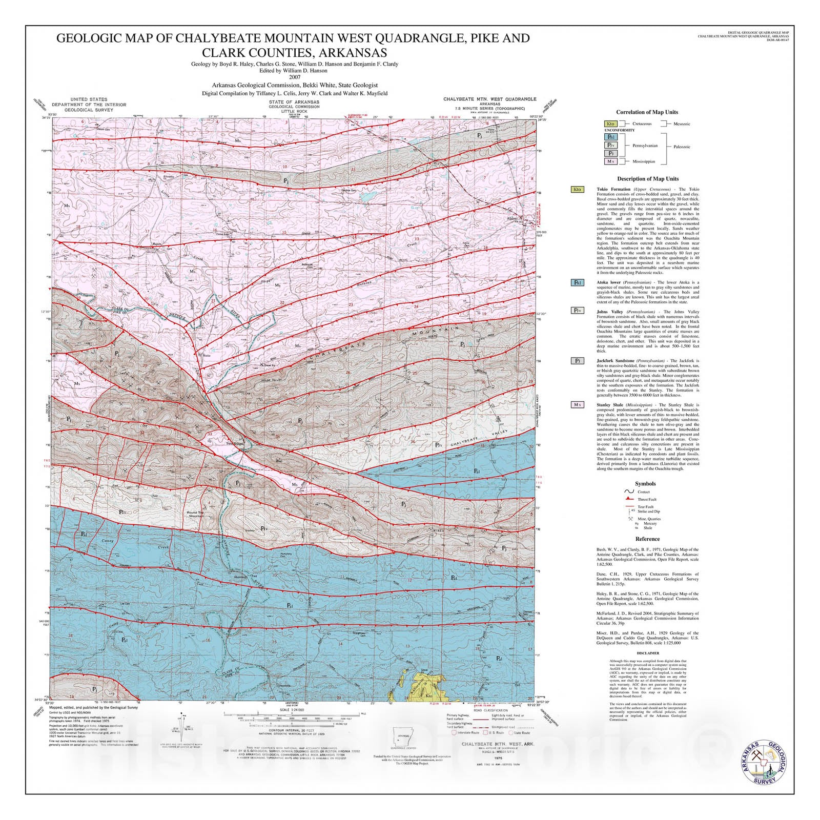 Map : Geologic map of the Chalybeate Mountain West Quadrangle, Pike and Clark counties, Arkansas, 2007 Cartography Wall Art :