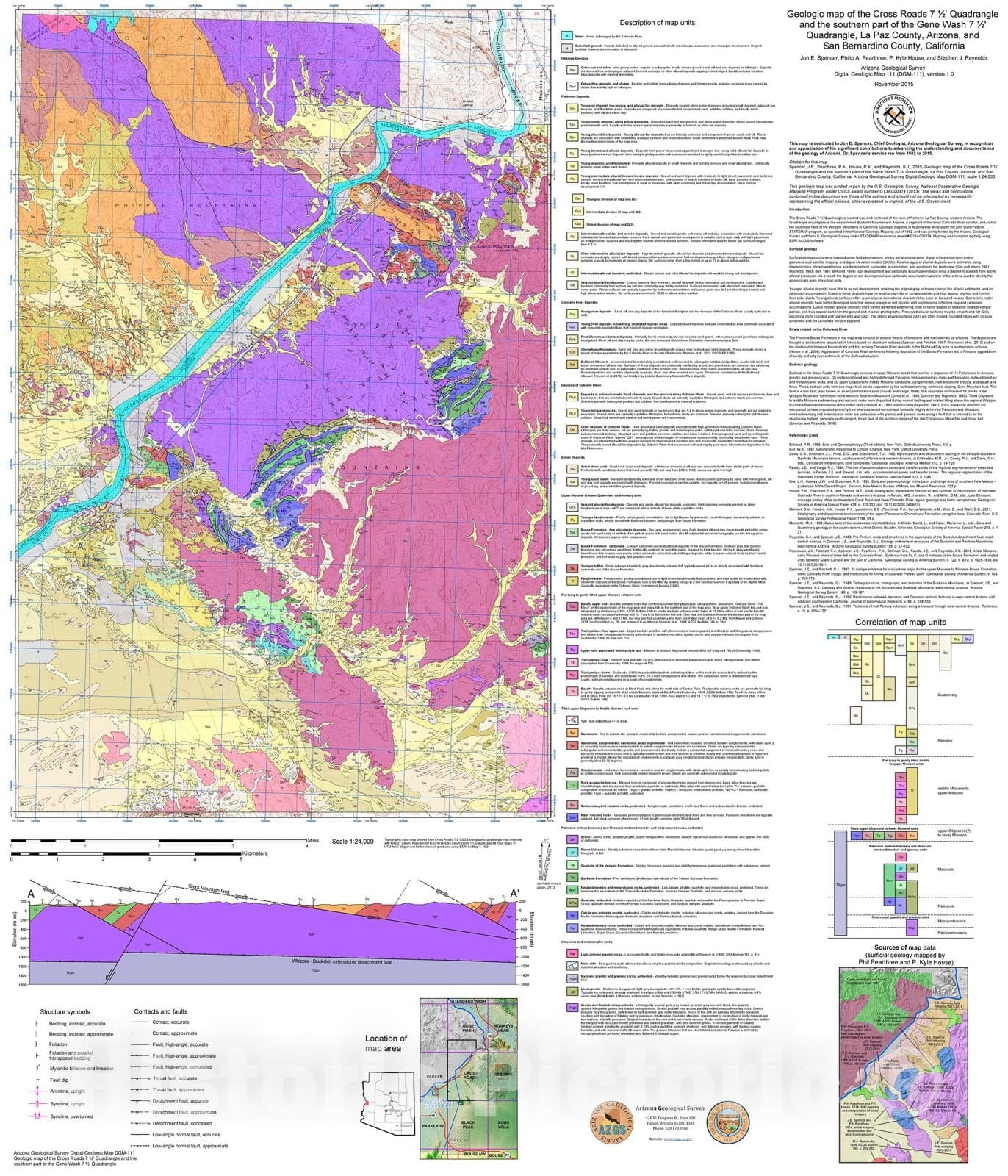 Map : Geologic map of the Cross Roads seven 1/2' Quadrangle and the southern part of the Gene Wash seven 1/2' Quadrangle, La Paz County, Arizona, 2015 Cartography Wall Art :