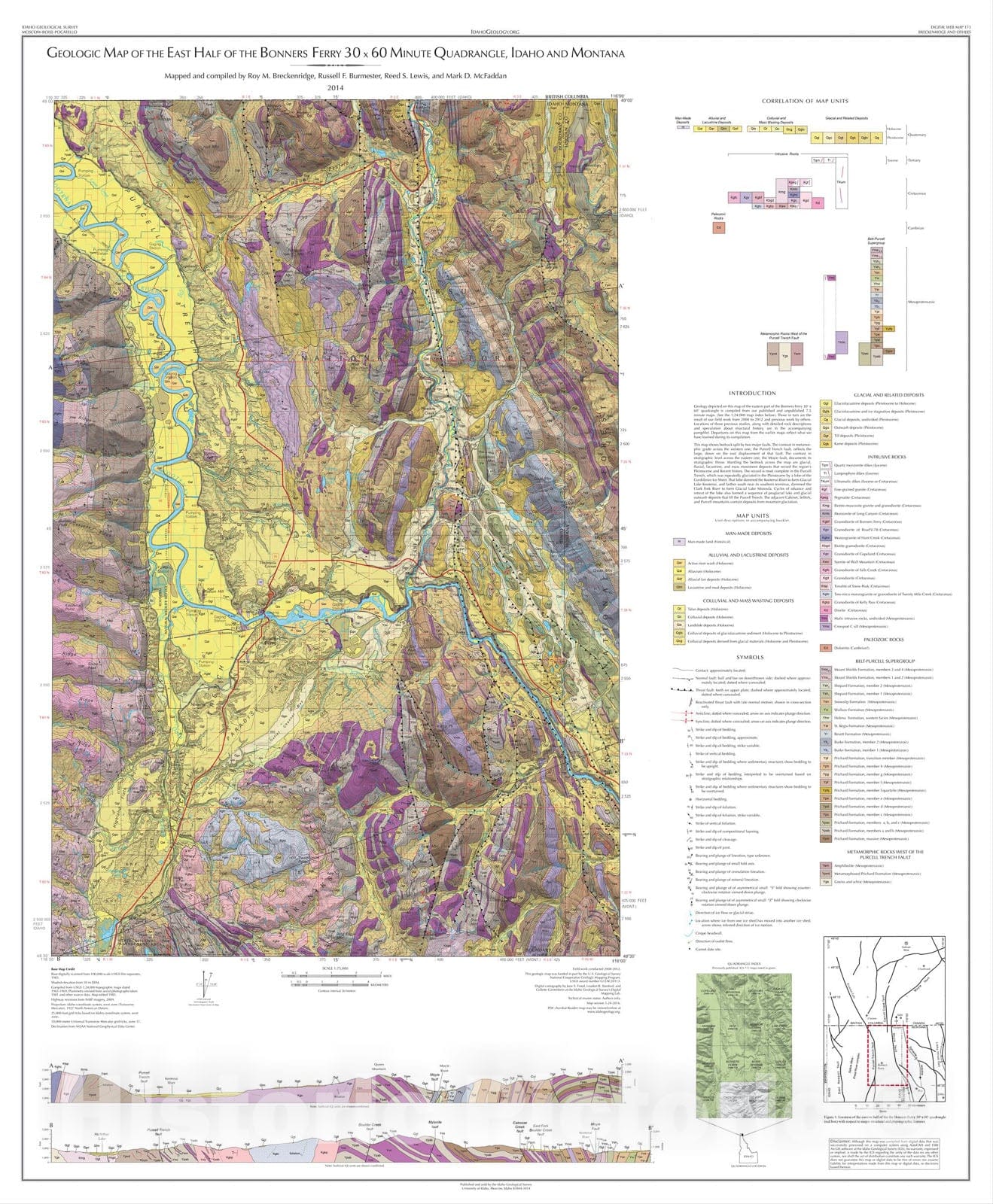 Map : Geologic Map of the East Half of the Bonners Ferry thirty x sixty Minute Quadrangle, Idaho and Montana, 2014 Cartography Wall Art :