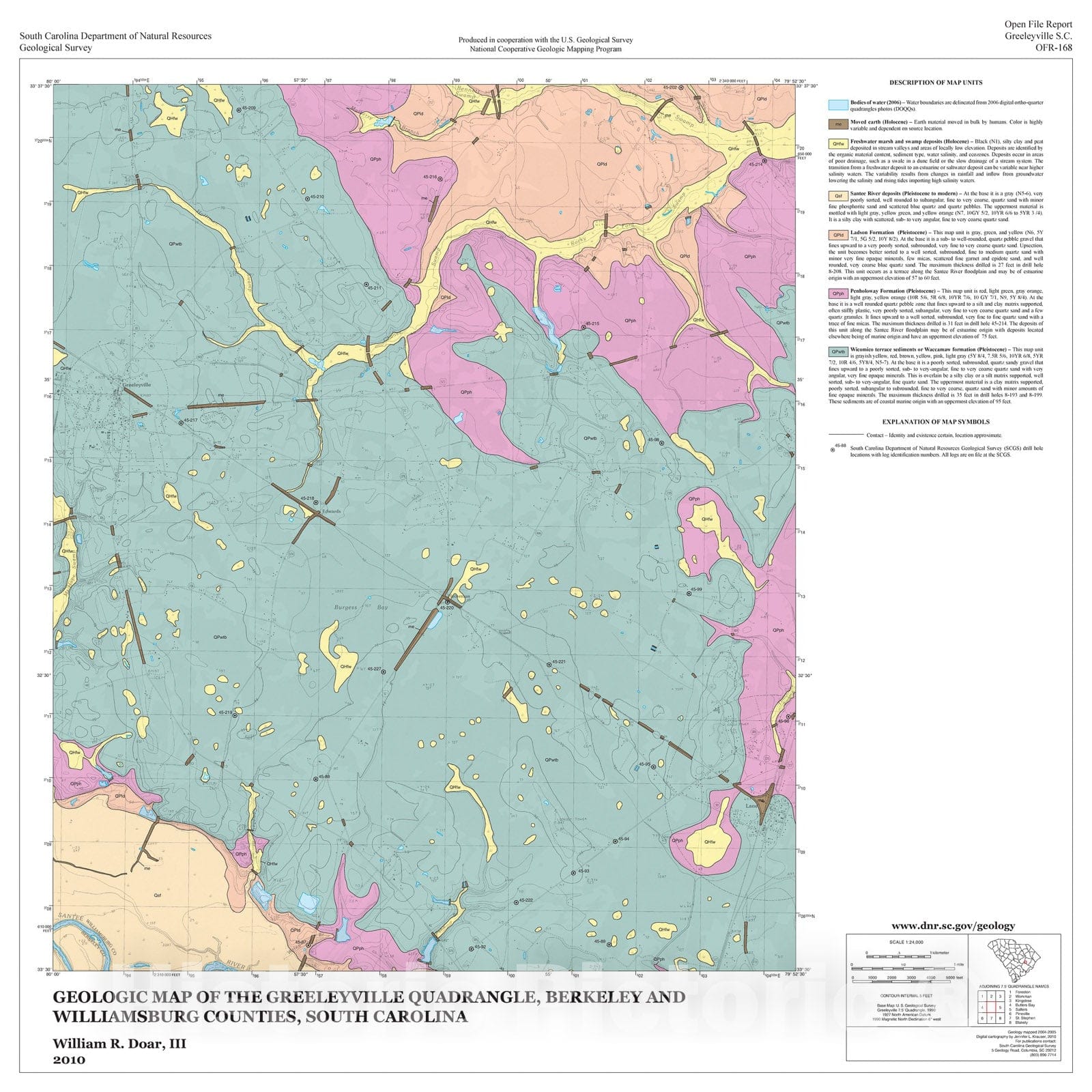 Map : Geologic Map of the Greeleyville Quadrangle, Berkeley and Williamsburg Counties, South Carolina, 2010 Cartography Wall Art :
