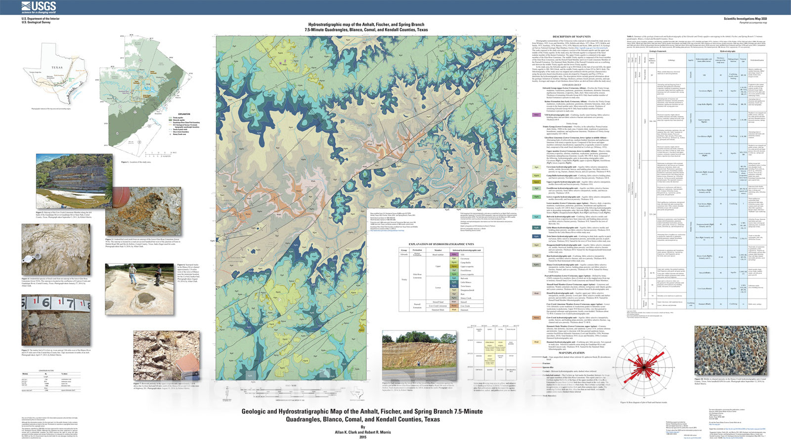 • Map : Geologic and hydrostratigraphic map of the Anhalt, Fischer, and Spring Branch 7.5-minute quadrangles, Blanco, Comal, and Kendall Counties, Texas, 2015 Cartography Wall Art :
