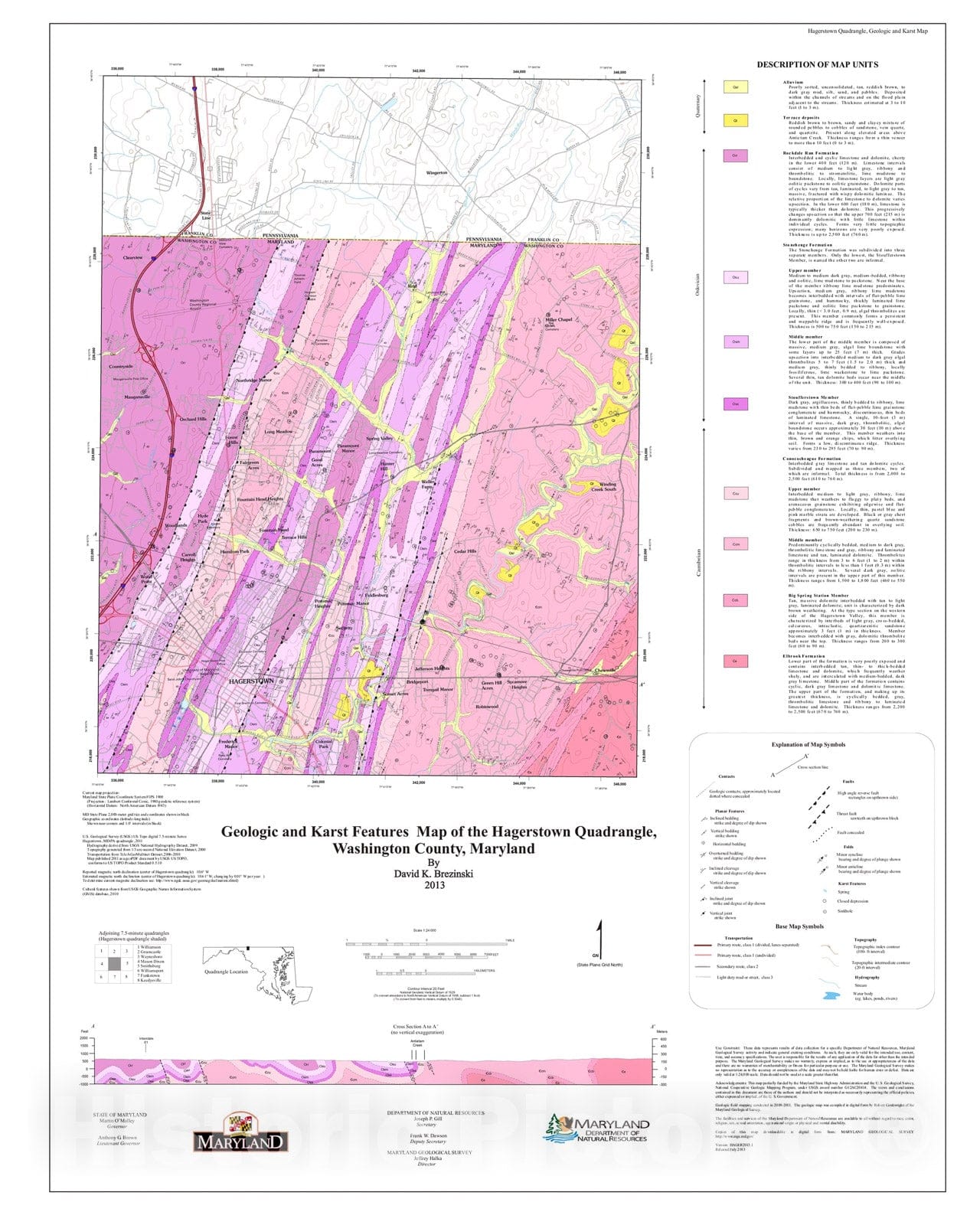 Map : Geologic and Karst Features Map of the Hagerstown Quadrangle, Washington County, Maryland, 2013 Cartography Wall Art :