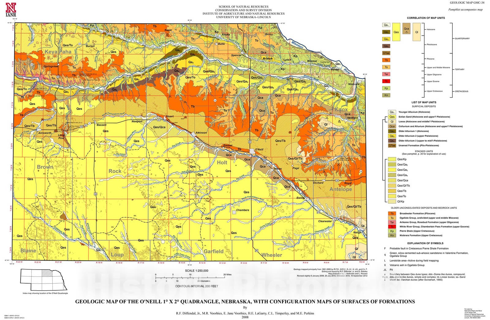 Map : Geologic map of the O'Neill one x two quadrangle, Nebraska, with configuration maps of surfaces of formations (with accompanying pamphlet), two008 Cartography Wall Art :