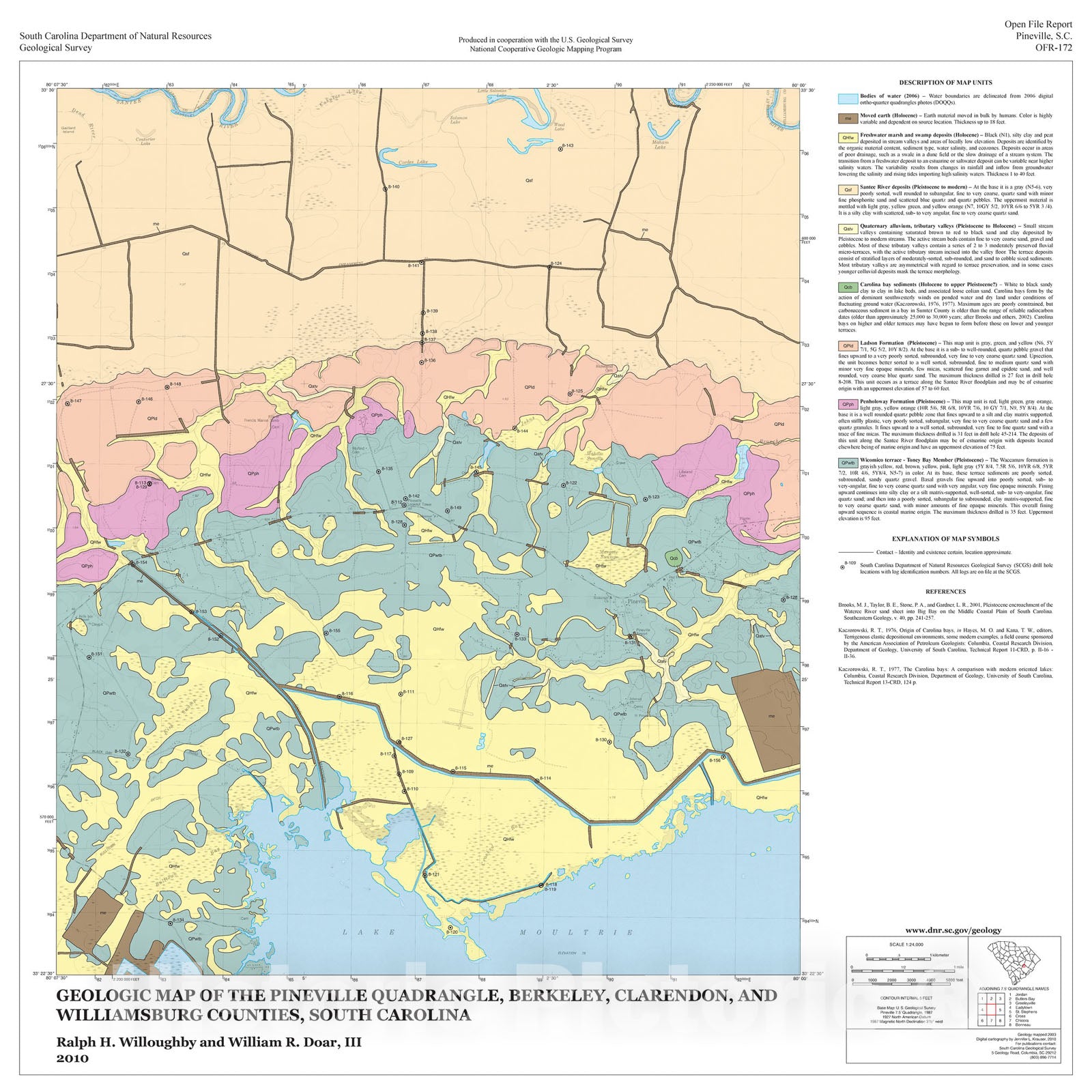Map : Geologic Map of the Pineville Quadrangle, Berkeley, Clarendon, and Williamsburg Counties, South Carolina, 2010 Cartography Wall Art :