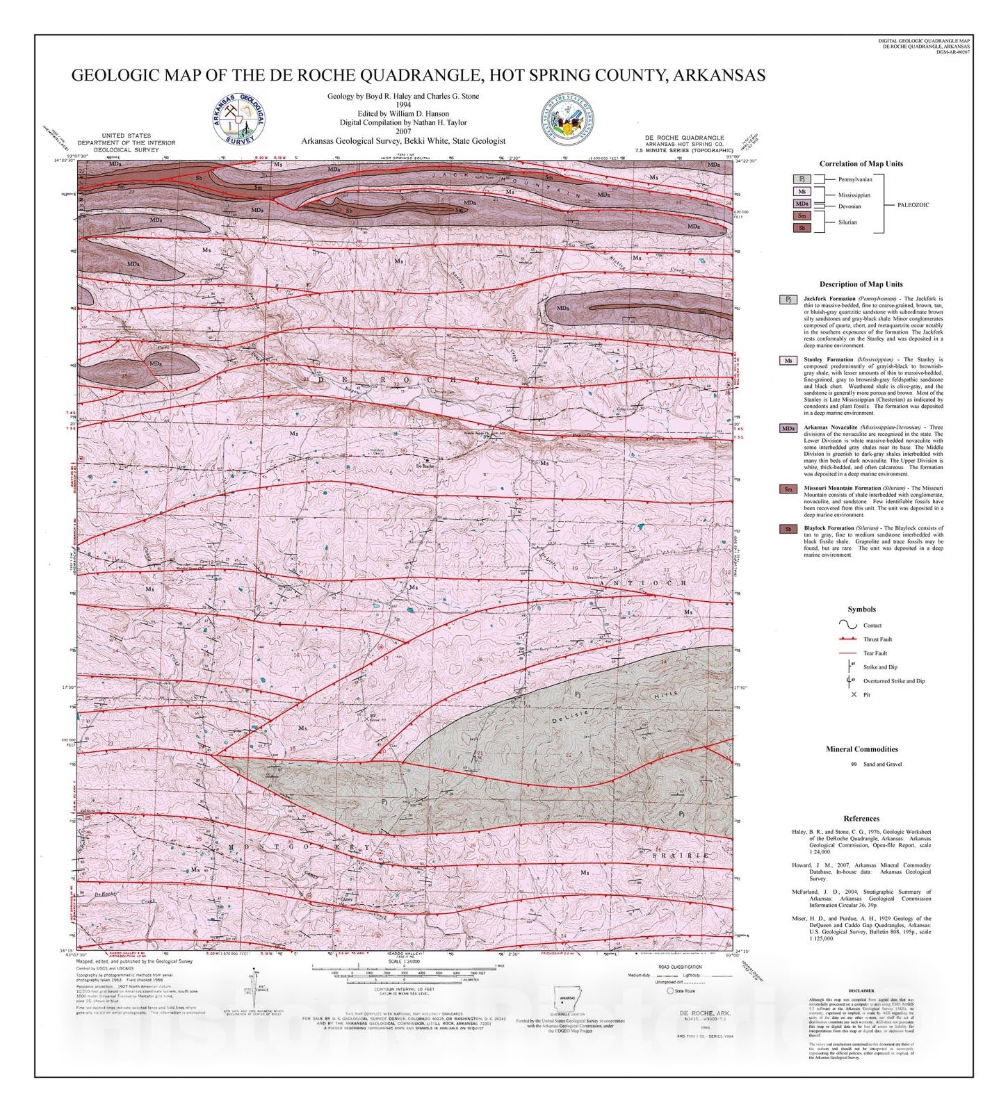 Map : Geologic map of the De Roche Quadrangle, Hot Spring County, Arkansas, 2007 Cartography Wall Art :