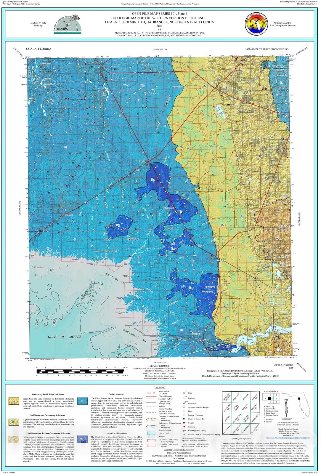 Map : Geologic map of the western portion of the USGS Ocala thirty x sixty minute quadrangle, north-central Florida, 2010 Cartography Wall Art :