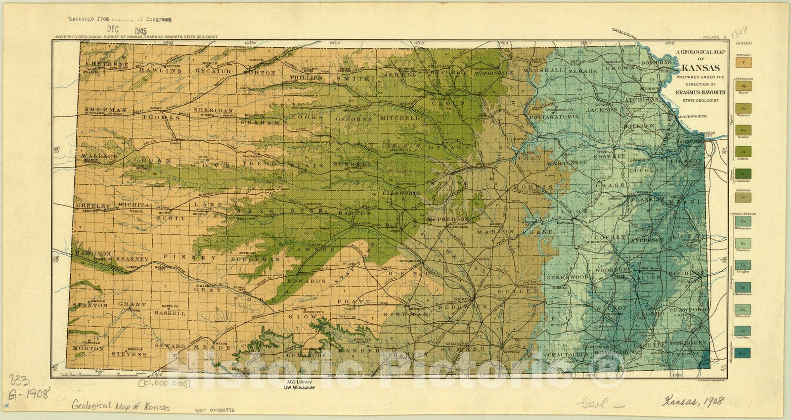 Map : Kansas 1908, A Geological map of Kansas , Antique Vintage Reproduction