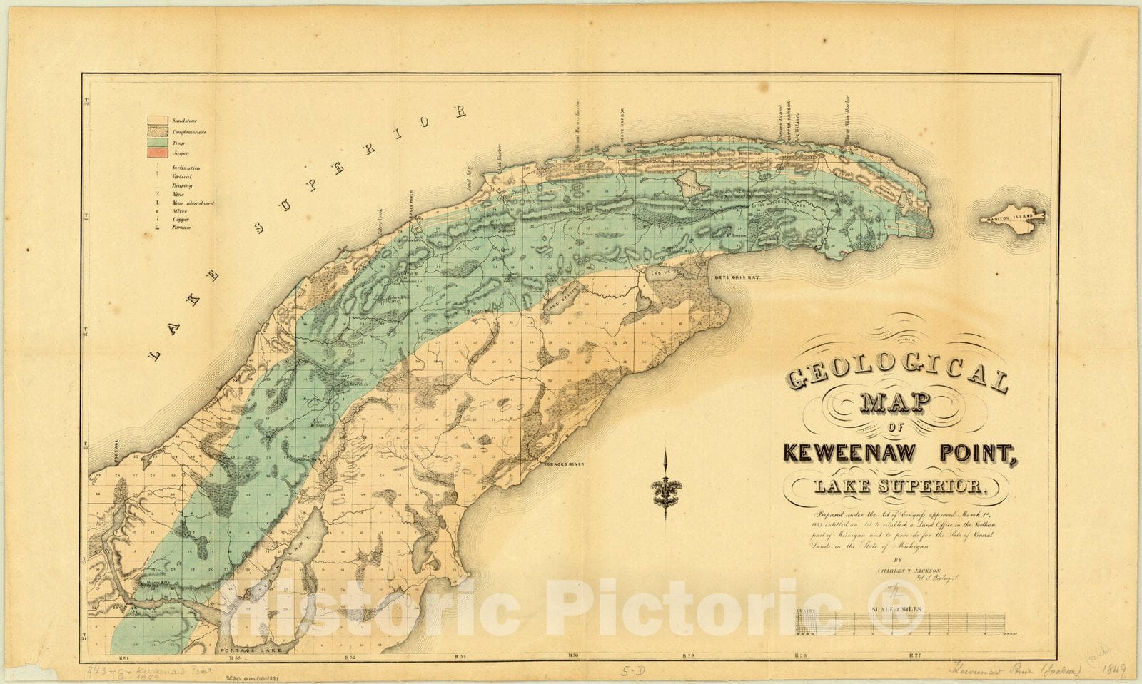 Map : Keweenaw Peninsula, Michigan 1849 2, Geological map of Keweenaw Point, Lake Superior , Antique Vintage Reproduction