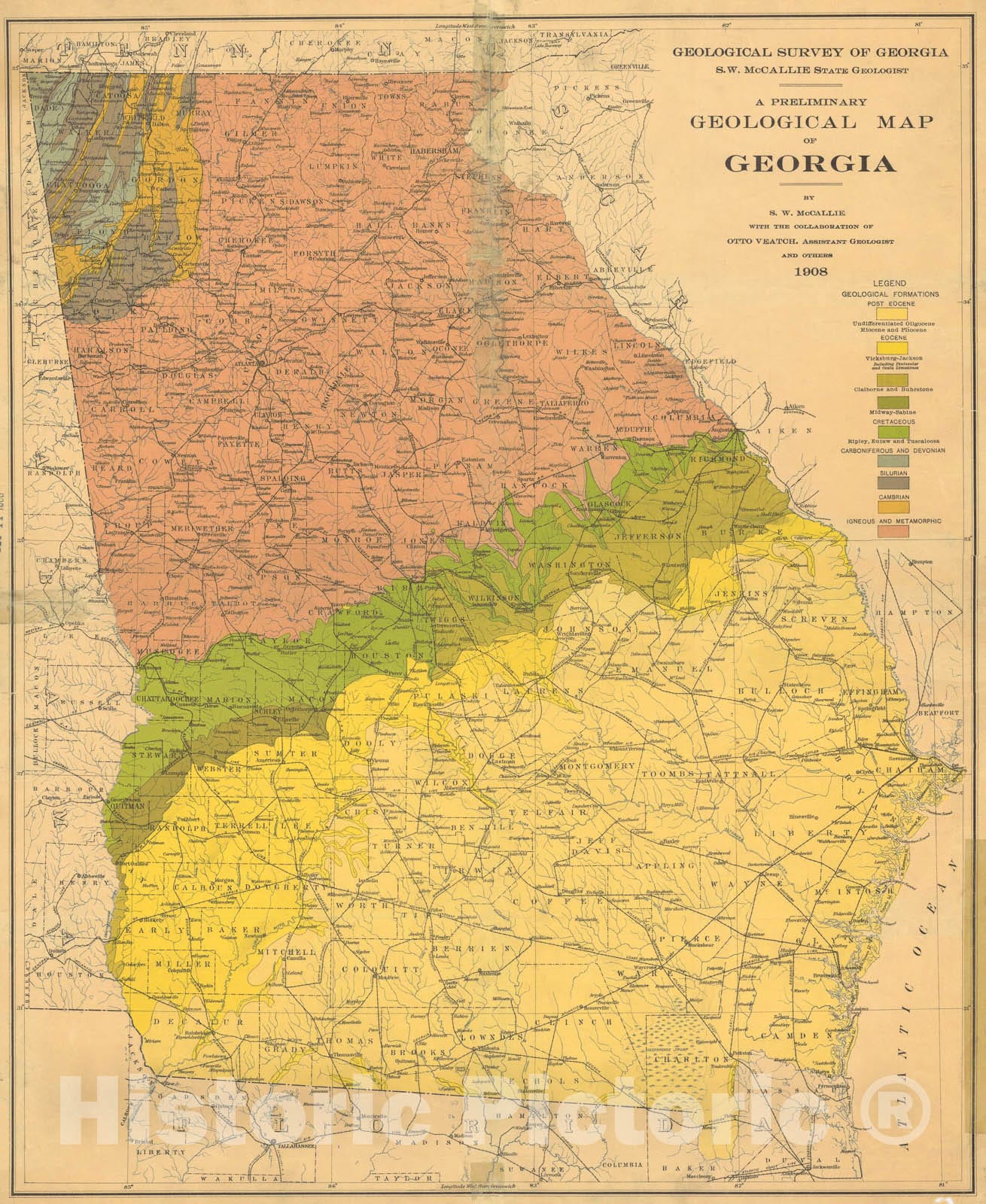 Map : A preliminary geological map of Georgia, 1908 Cartography Wall Art :