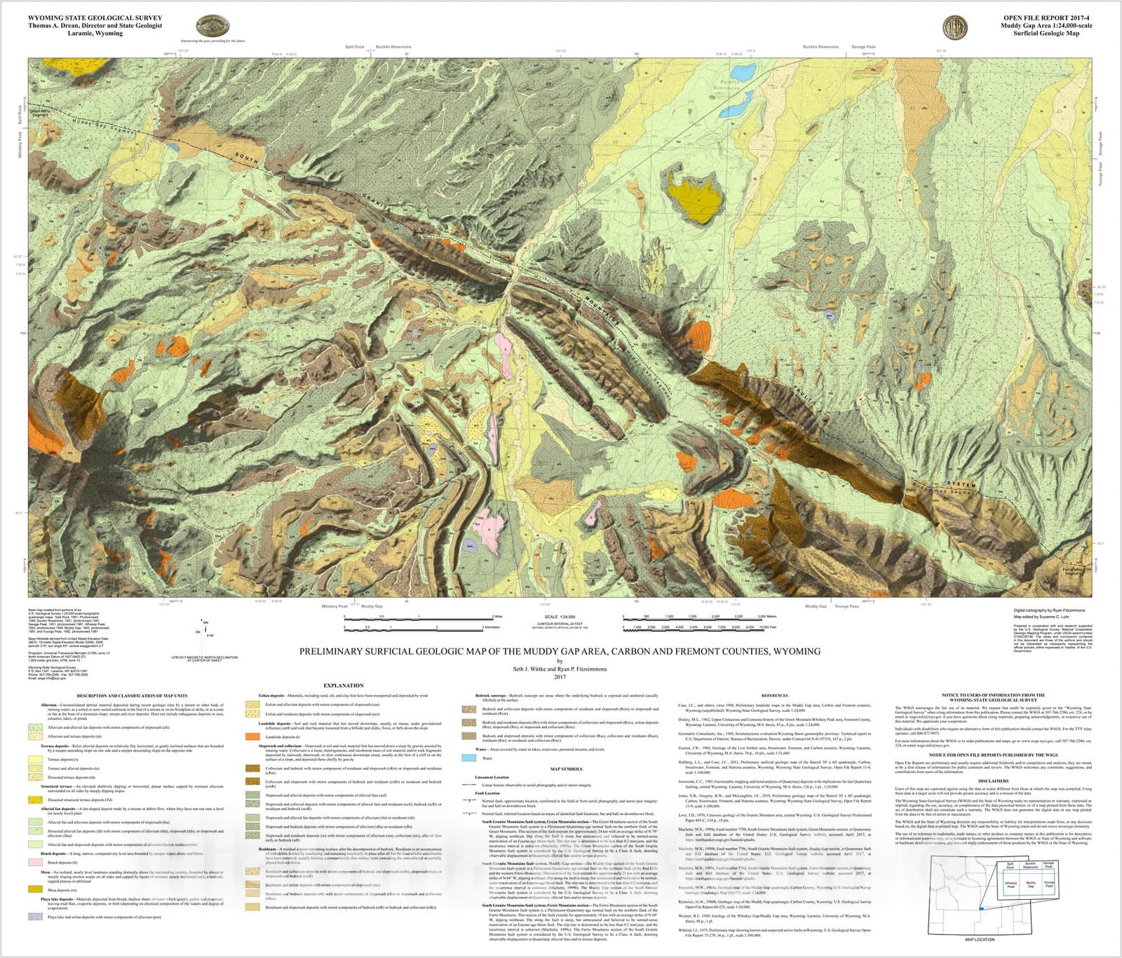 Map : Preliminary surficial geologic map of the Muddy Gap Area, Carbon and Fremont counties, Wyoming, 2017 Cartography Wall Art :