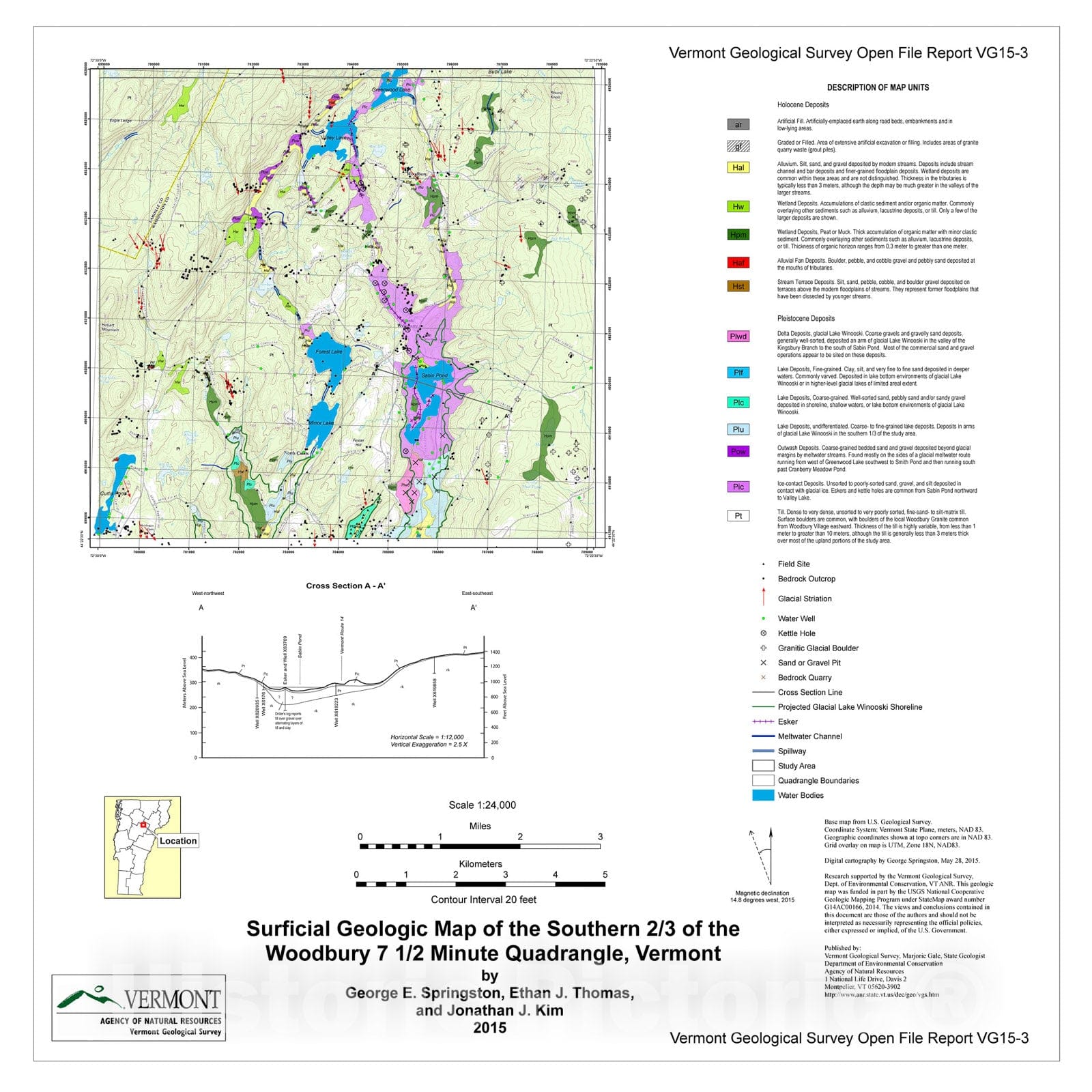 Map : Surficial Geologic Map of the Southern Two-Thirds of the Woodbury seven 1/2 Minute Quadrangle, Vermont, 2015 Cartography Wall Art :