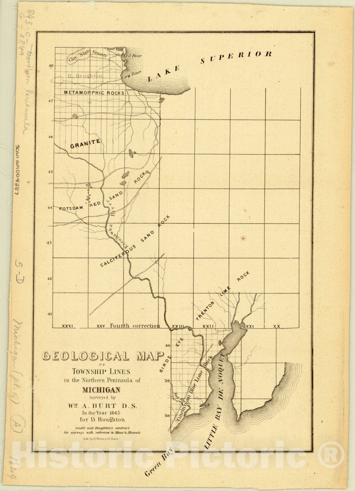 • .Map : Upper Peninsula Michigan 1849, Geological map of township lines in the northern peninsula of Michigan, Antique Vintage Reproduction