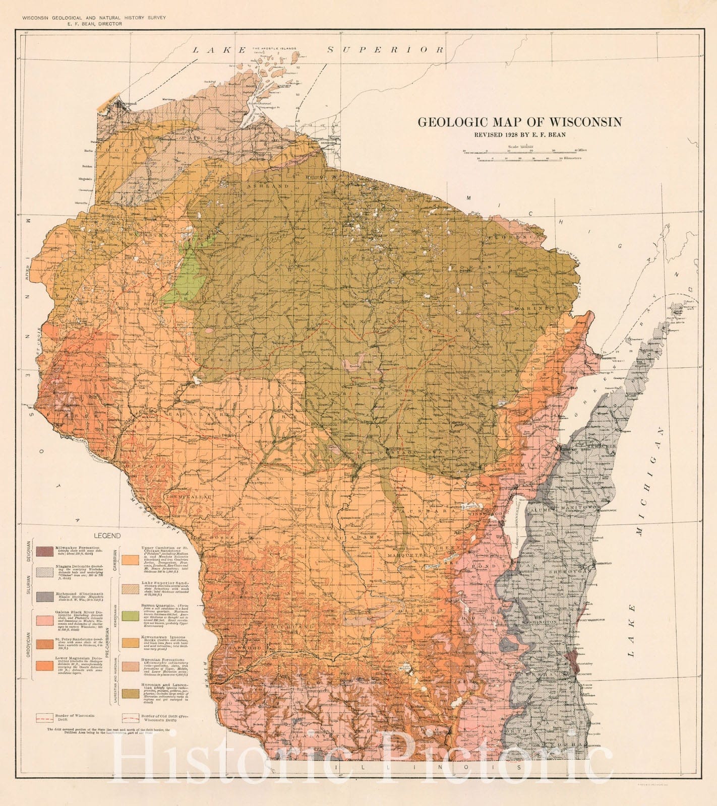 Map : Wisconsin 1928, Geologic map of Wisconsin, Antique Vintage Reproduction