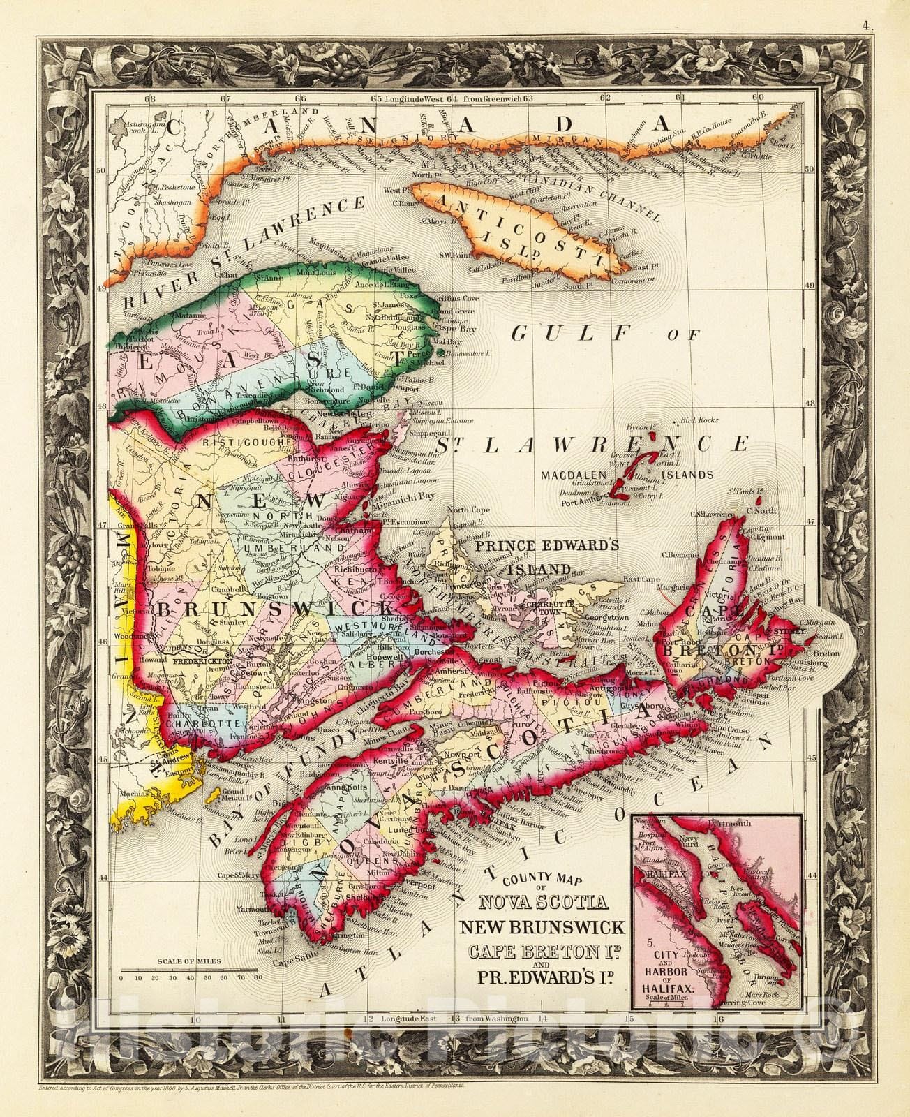 • .Historic Map : 1860 County Map Of Nova Scotia New Brunswick Cape Breton Id. And Pr. Edward's Id. - Vintage Wall Art