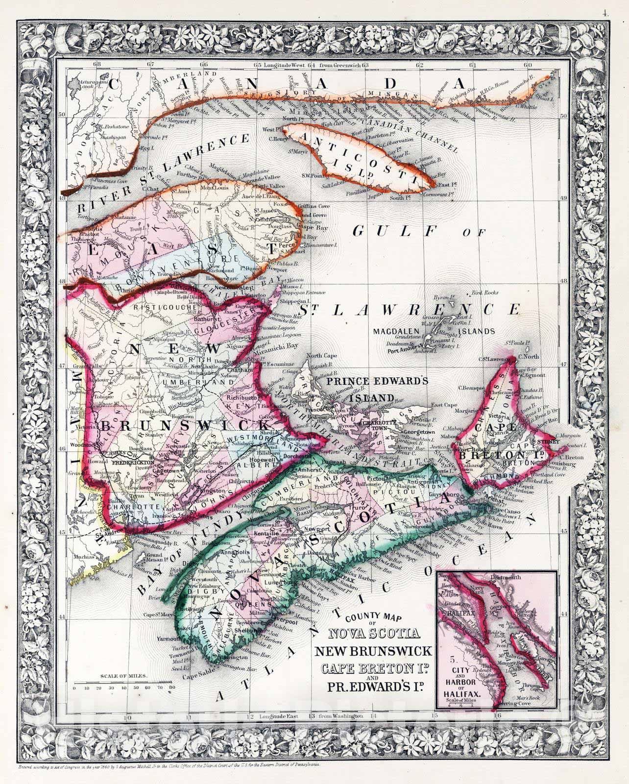 Historic Map : 1865 County map of Nova Scotia, New Brounswick, Cape Breton Id. and Pr. Edward's Id. - Vintage Wall Art