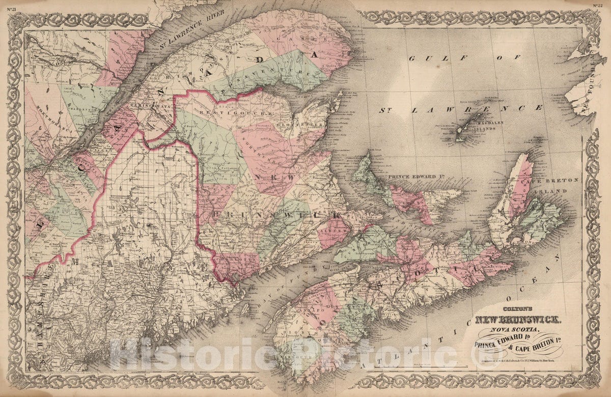 Historic Map : 1866 New Brunswick, Nova Scotia, Prince Edward Island, and Cape Breton Inland. - Vintage Wall Art