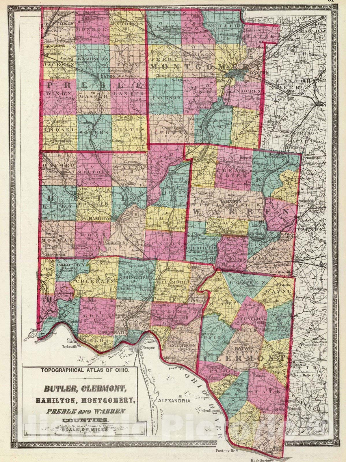 Historic Map : 1872 Butler, Clermont, Hamilton, Montgomery, Preble and Warren counties. - Vintage Wall Art