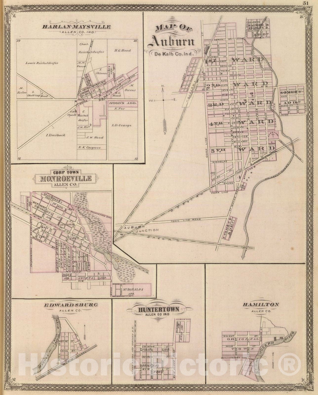 Historic Map : 1876 Map of Auburn, De Kalb Co, Ind. (with) Harlan Maysville, Monroeville, Edwardsburg, Huntertown, Hamilton. - Vintage Wall Art