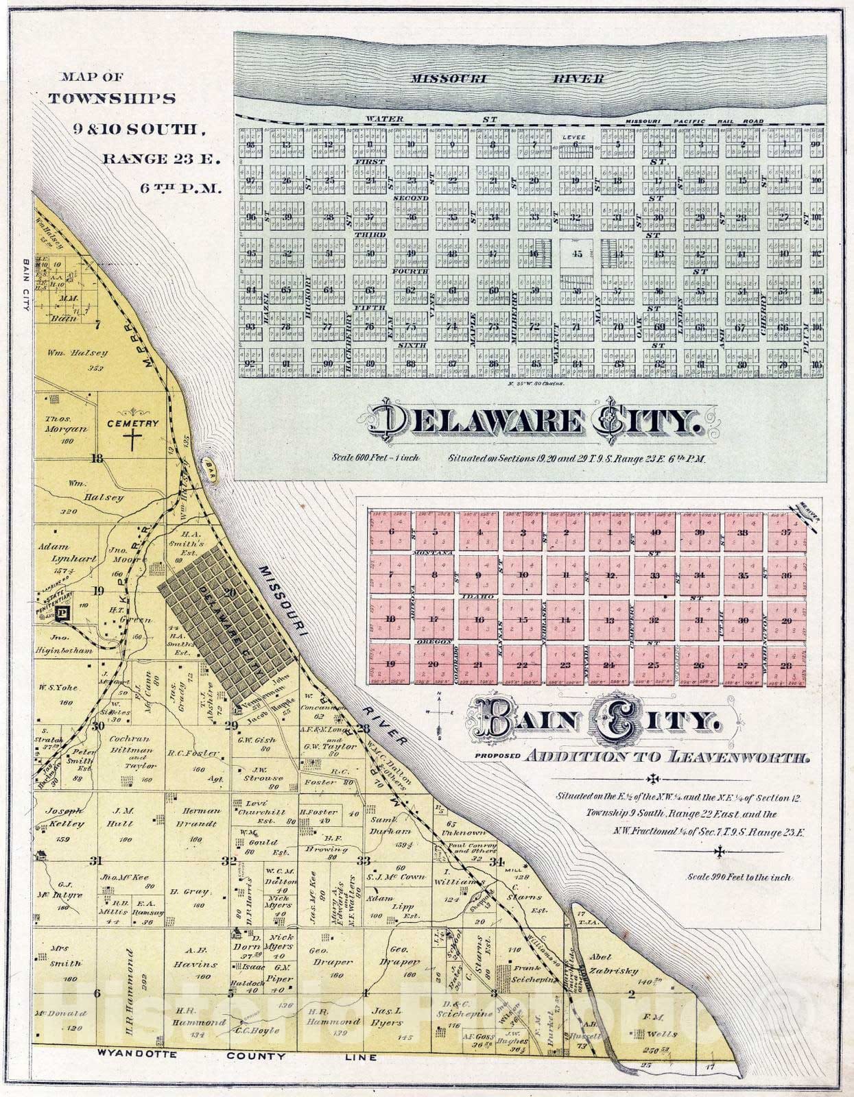 1878 Townships 9 and 10 South, Range 23 E, Leavenworth County, Kansas. Delaware City. Bain City.