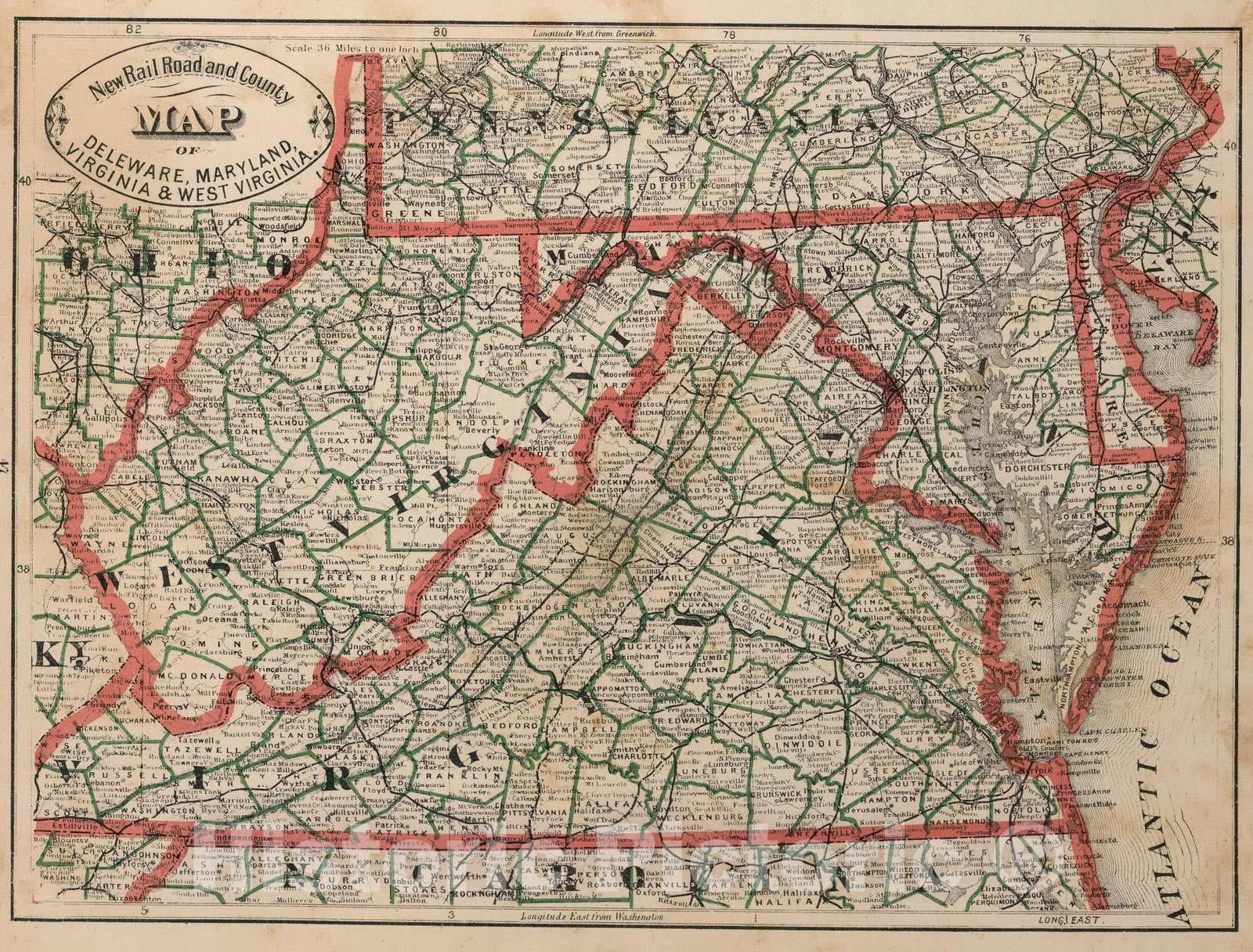 Historic Map : 1883 New Rail Road and County Map of Deleware (Delaware), Maryland, Virginia & West Virginia. - Vintage Wall Art
