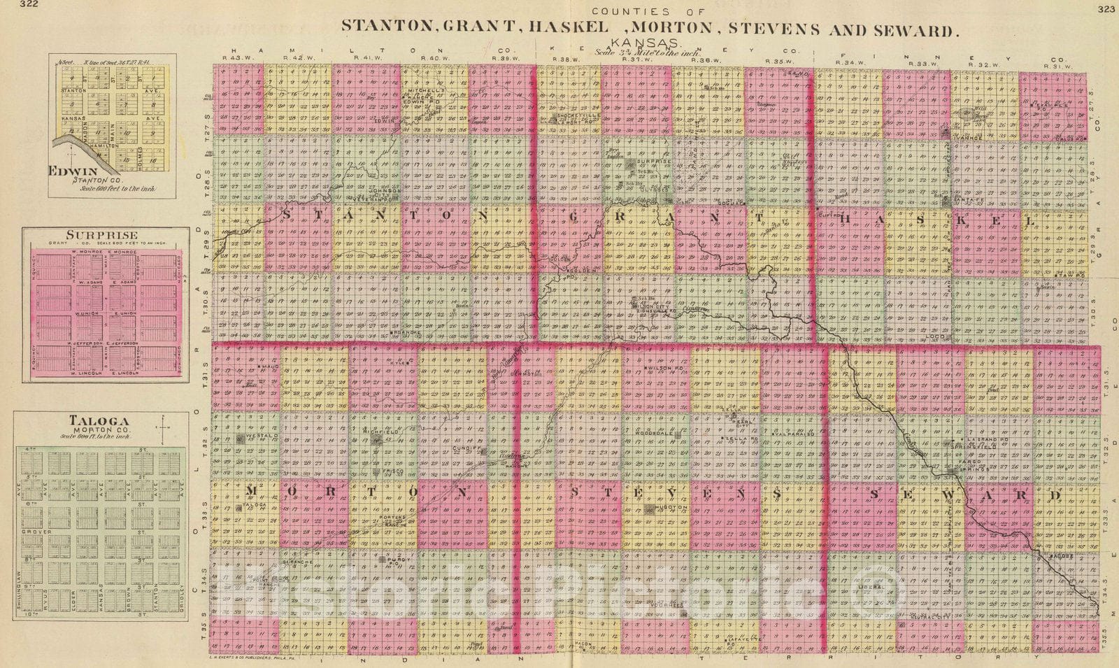 Historic Map : 1887 Stanton, Grant, Haskel, Morton, Stevens, Seward counties, Kansas. - Vintage Wall Art