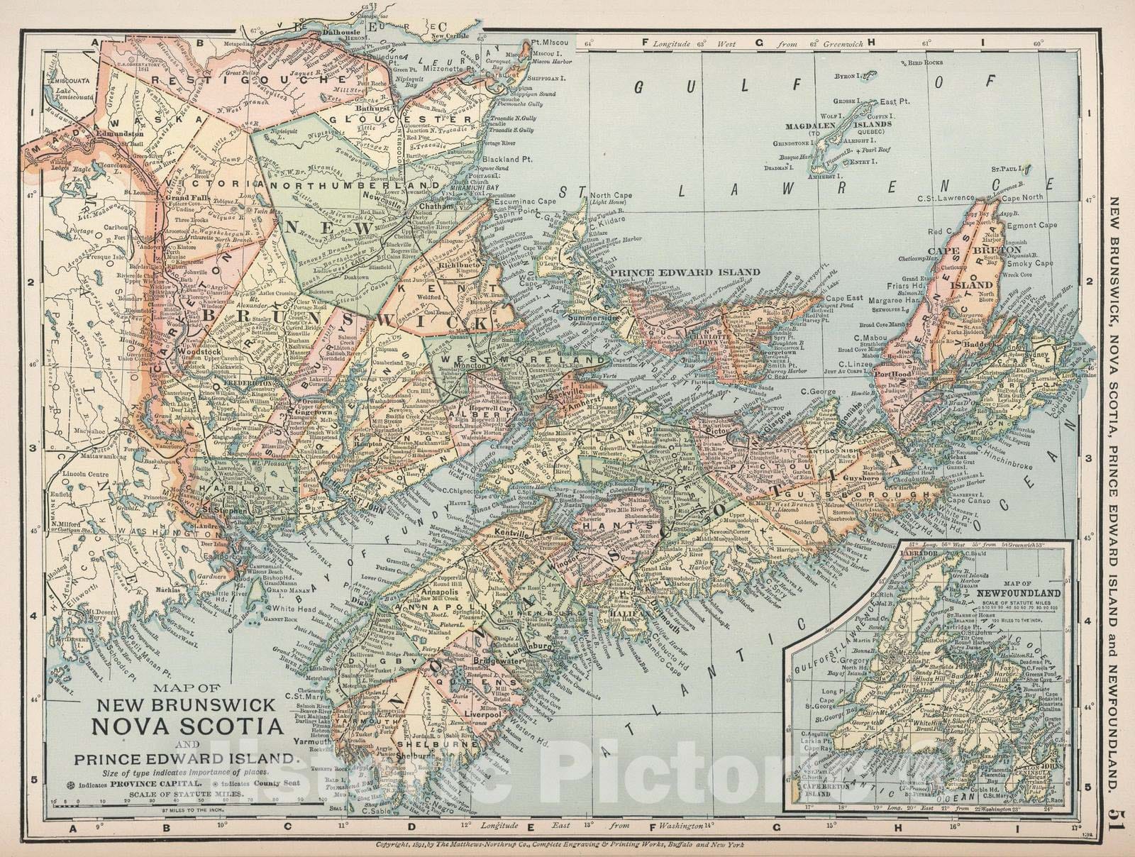 Historic Map : 1891 Map of New Brunswick, Nova Scotia, Prince Edward Island and Newfoundland 51 - Vintage Wall Art