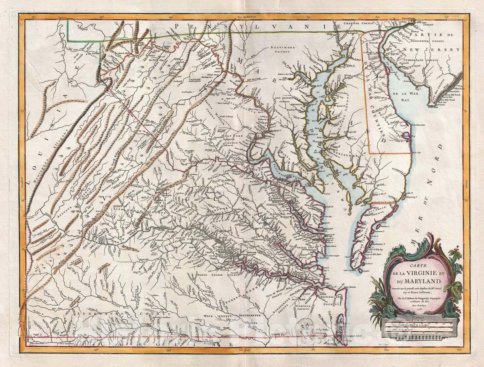 • .Historic Map : The Chesapeake Bay, Virginia, Maryland, and Delaware, Vaugonday, 1755, Vintage Wall Art