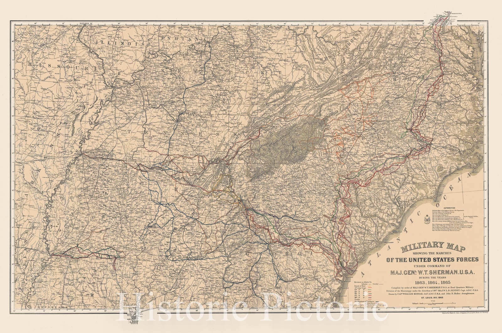 Historic Map : The Marches of General Sherman during The American Civil War, Kossak, 1865, Vintage Wall Art