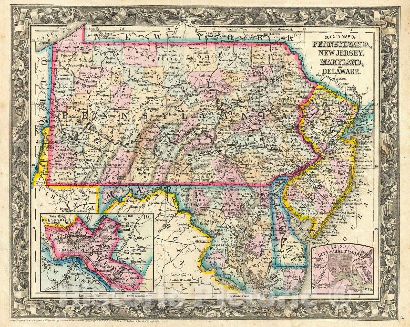 Historic Map : Mitchell Map of Pennsylvania, New Jersey, Delaware and Maryland , 1863, Vintage Wall Art