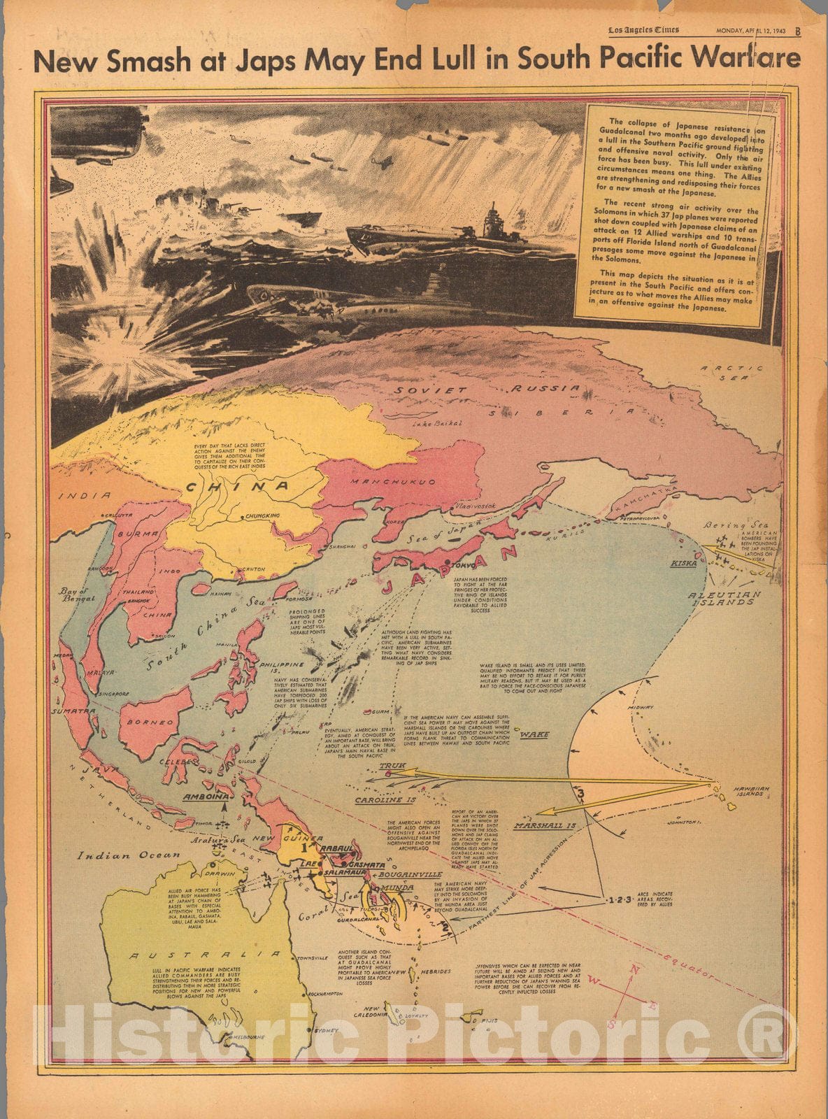 Historic Map : New smash at Japs may end lull in South Pacific warfare 1943 - Vintage Wall Art