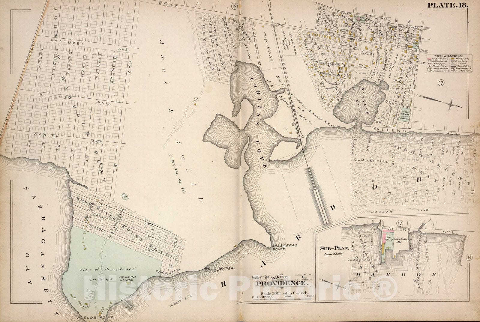 Plate 18. Part of Ward 9, Providence. | Atlas of the City of Providence R.I. and Environs. From Official Records, Private Plans and Actual Surveys. Published by G.M. Hopkins, C.E. 320 Walnut St. Philadelphia. 1882. Entered ... 1882 by G.M. Hopkins.... | A highly detailed atlas resembling insurance maps with building materials and types and footprints, fire hydrants, water pipes, sewer lines, steam railroad lines, and ward numbers. Maps 200 to 600 feet to the inch. Hand colored.