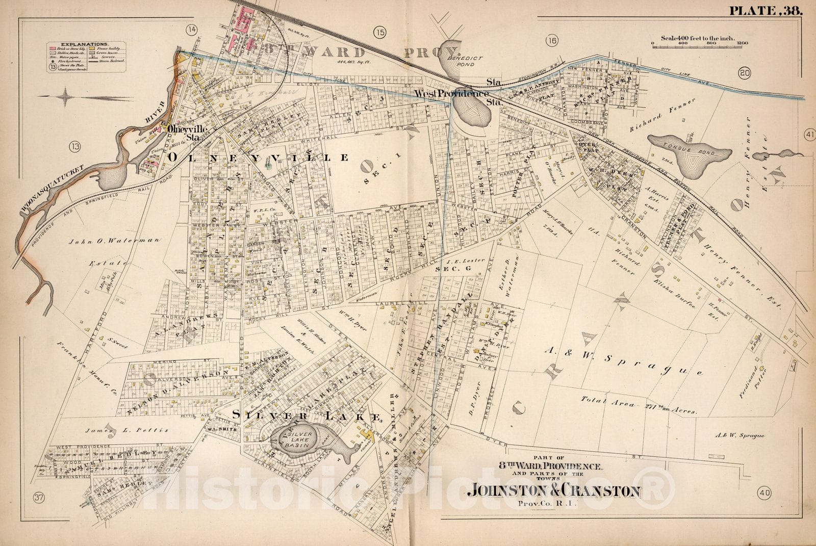 Plate 38. Part of 8th Ward, Providence and Parts of the Towns Johnston & Cranston, Prov., R.I. | Atlas of the City of Providence R.I. and Environs. From Official Records, Private Plans and Actual Surveys. Published by G.M. Hopkins, C.E. 320 Walnut St. Philadelphia. 1882. Entered ... 1882 by G.M. Hopkins.... | A highly detailed atlas resembling insurance maps with building materials and types and footprints, fire hydrants, water pipes, sewer lines, steam railroad lines, and ward numbers. Maps 200 to 600 feet to the inch. Hand colored.