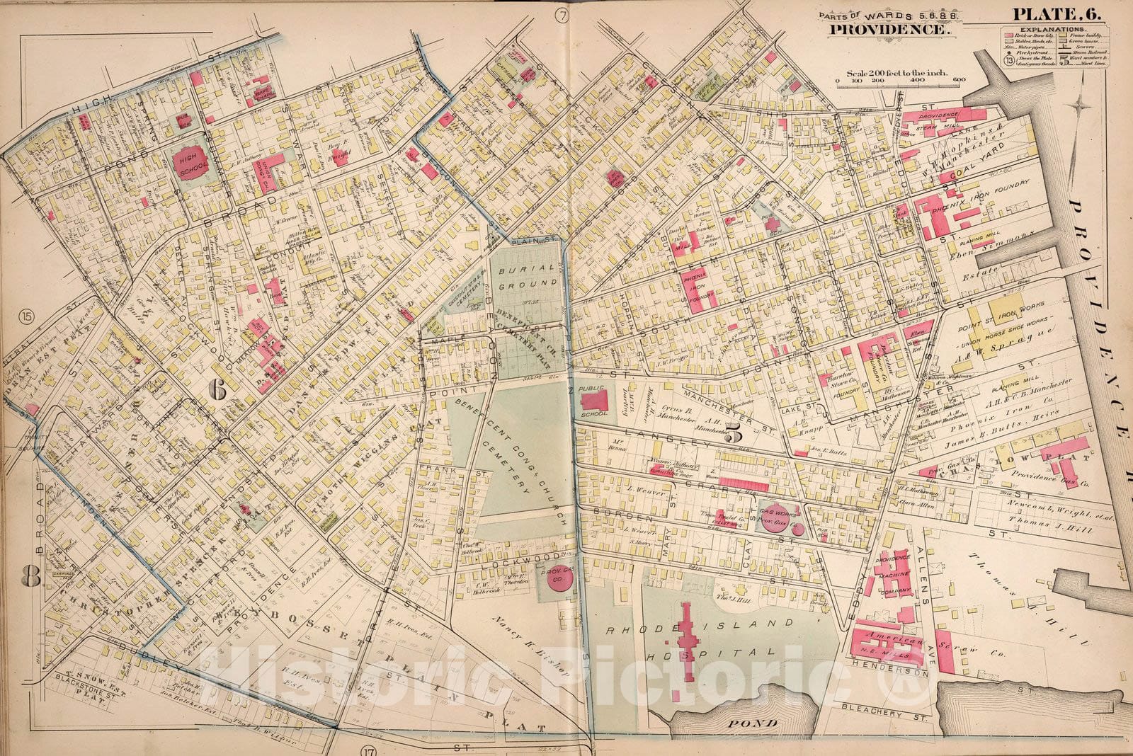 Plate 6. Parts of Wards 5, 6, & 8, Providence. | Atlas of the City of Providence R.I. and Environs. From Official Records, Private Plans and Actual Surveys. Published by G.M. Hopkins, C.E. 320 Walnut St. Philadelphia. 1882. Entered ... 1882 by G.M. Hopkins.... | A highly detailed atlas resembling insurance maps with building materials and types and footprints, fire hydrants, water pipes, sewer lines, steam railroad lines, and ward numbers. Maps 200 to 600 feet to the inch. Hand colored.