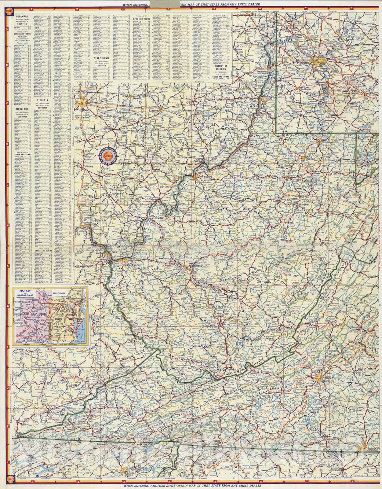 • .Historic Map : Shell Highway Map of Delaware - Maryland, Virginia, W. Virginia. (eastern portion)., 1956, Vintage Wall Art
