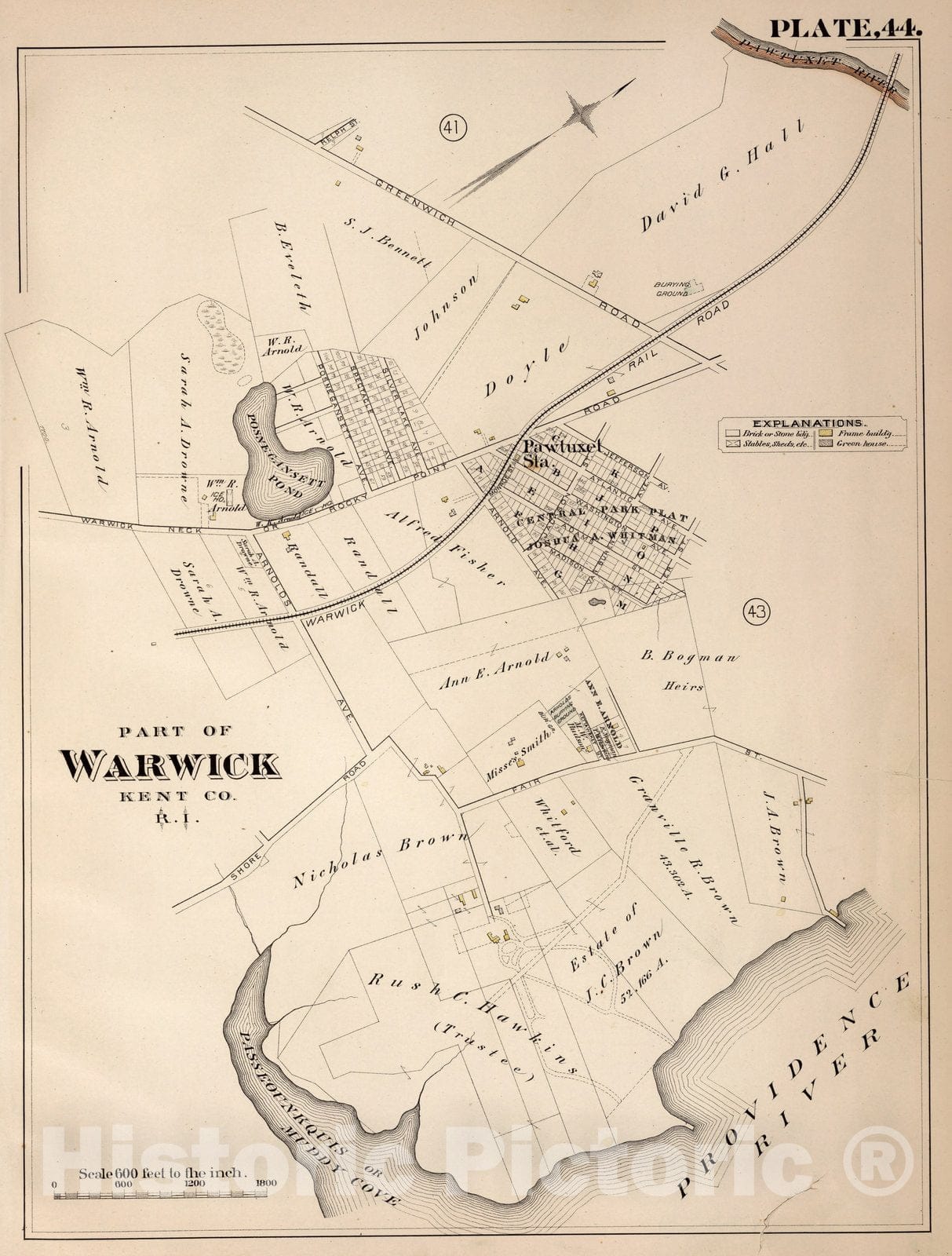 Plate 44. Part of Warwick, Kent Co., R.I. | Atlas of the City of Providence R.I. and Environs. From Official Records, Private Plans and Actual Surveys. Published by G.M. Hopkins, C.E. 320 Walnut St. Philadelphia. 1882. Entered ... 1882 by G.M. Hopkins.... | A highly detailed atlas resembling insurance maps with building materials and types and footprints, fire hydrants, water pipes, sewer lines, steam railroad lines, and ward numbers. Maps 200 to 600 feet to the inch. Hand colored.