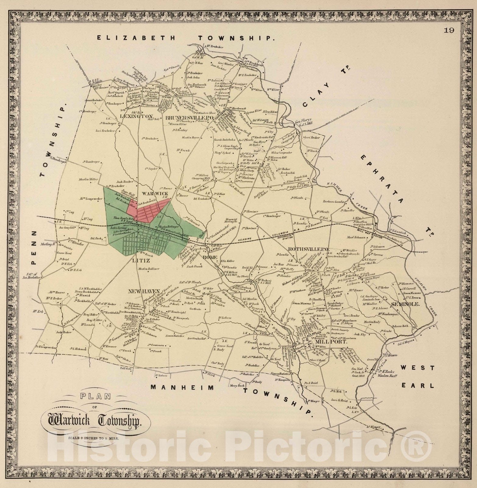 Historic Wall Map : 1864 Warwick Township, Lancaster County, Pennsylvania. - Vintage Wall Art