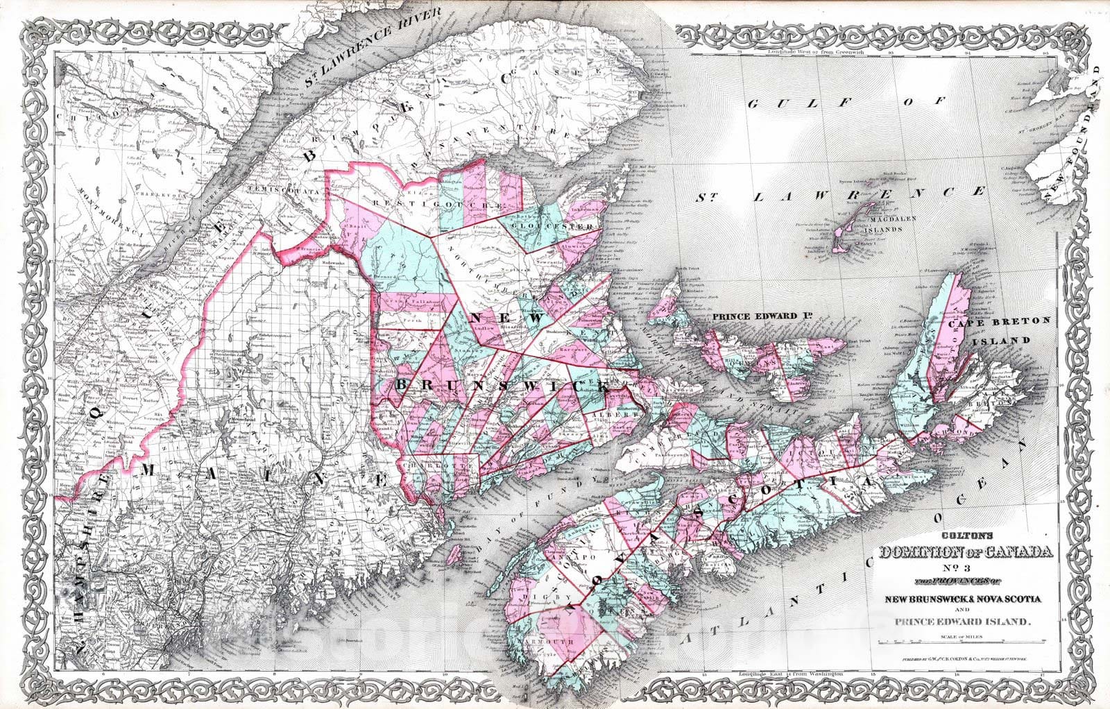 Historic Wall Map : 1869 Dominion of Canada. Provinces of New Brunswick & Nova Scotia and Prince Edward Island. - Vintage Wall Art