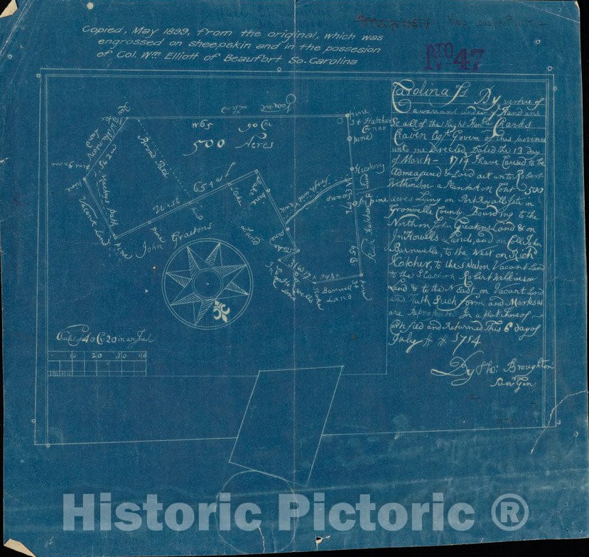 Carolina is by vertue of a warr and under of hand and se all of the Right Honble. Charles Craven, Esqt. Governr. of this province unto me directed, dated the 13 day of March - 1714 I have caused to be ad measured & laid out unto Robert Wilkinson a plantation cont. 500 acres lying on Port Royall jsts in Gromvelle County bounding to the north on John Greatons land & on Jno. Howells lands, and on Coll. John Barnwells, to the west on Rich Hatcher, to the s. west on vacant land to the s. east on Robert Wilkinson land & to the n. east on vacant land and auth such form and marks as are represented in a plat hereof certefied and returned this 6 day of July 1714