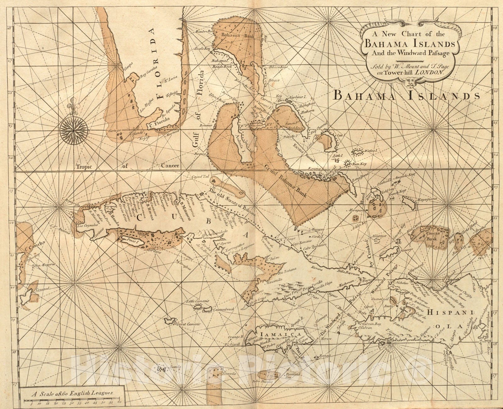 Historical Map, 1737 A New Chart of The Bahama Islands and The Windward Passage, Vintage Wall Art