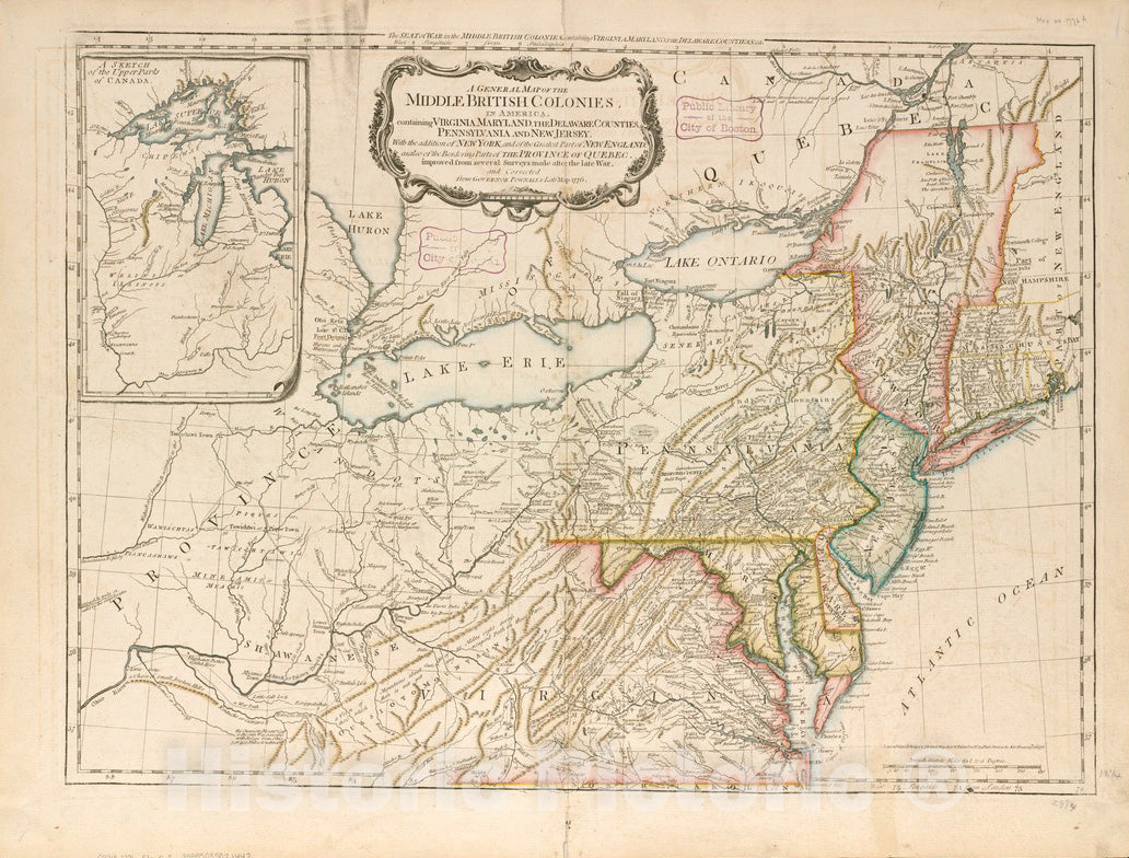 A general map of the middle British colonies, in America : containing Virginia, Maryland, the Delaware counties, Pennsylvania and New Jersey : with the addition of New York, and the greatest part of New England, as also of the bordering parts of the province of Quebec, improved from several surveys made after the late war, and corrected from Governor Pownall's late map 1776