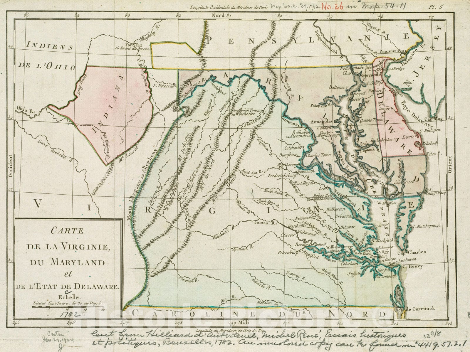 Historical Map, 1782 Carte de la Virginie, du Maryland et de l'etat de Delaware, Vintage Wall Art