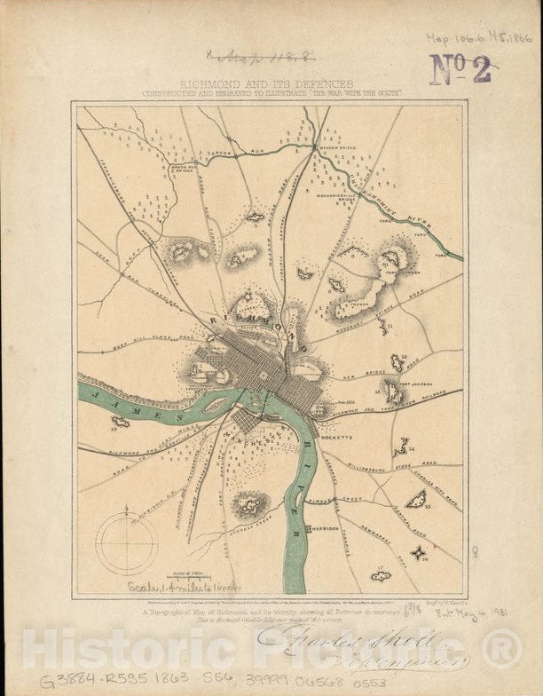 Historical Map, 1863-1867 Richmond and its defences : Constructed and Engraved to illustrate 'The war with The South', Vintage Wall Art