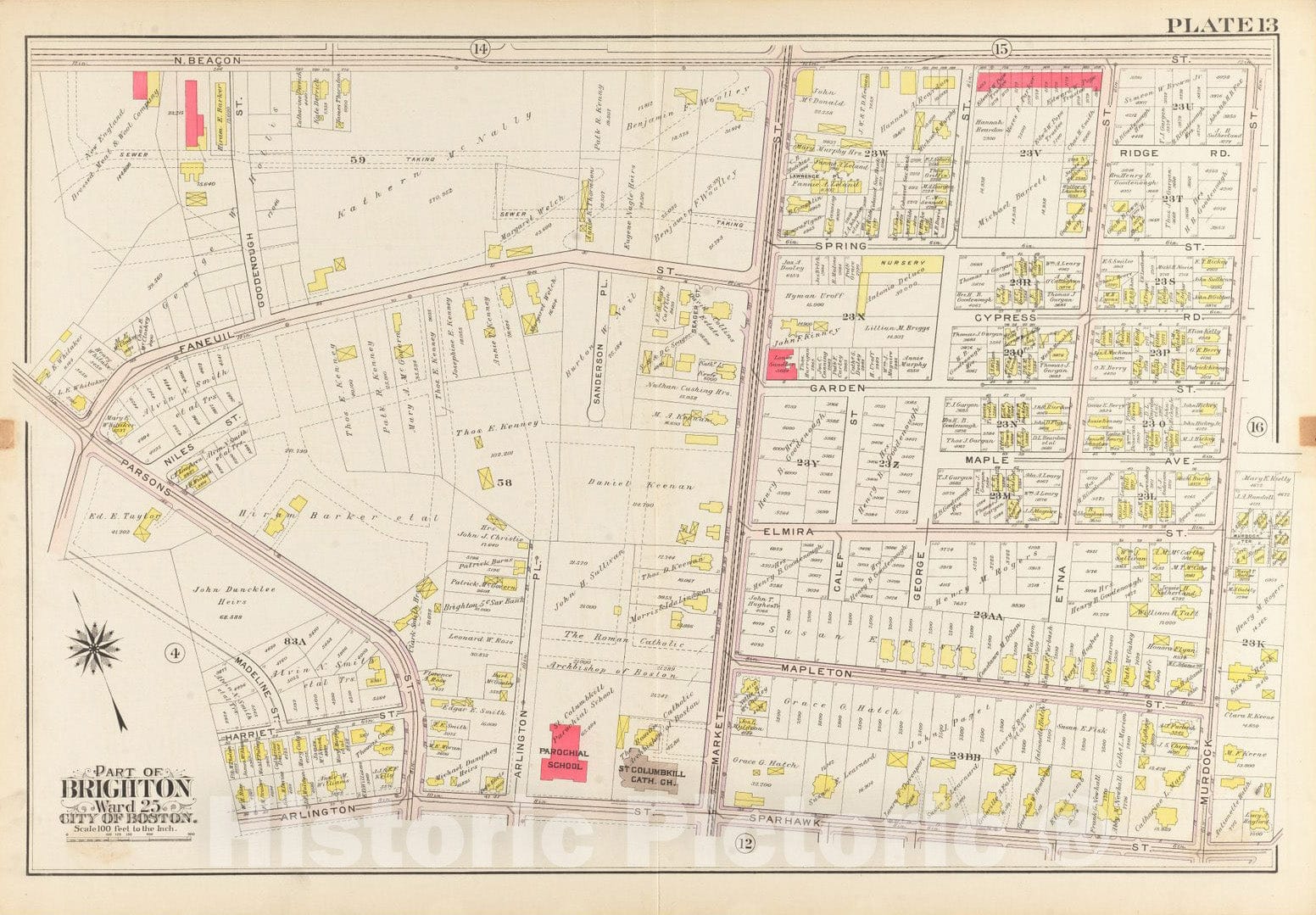 • .Historical Map, 1909 Atlas of The City of Boston, Ward 25, Brighton : Plate 13, Vintage Wall Art