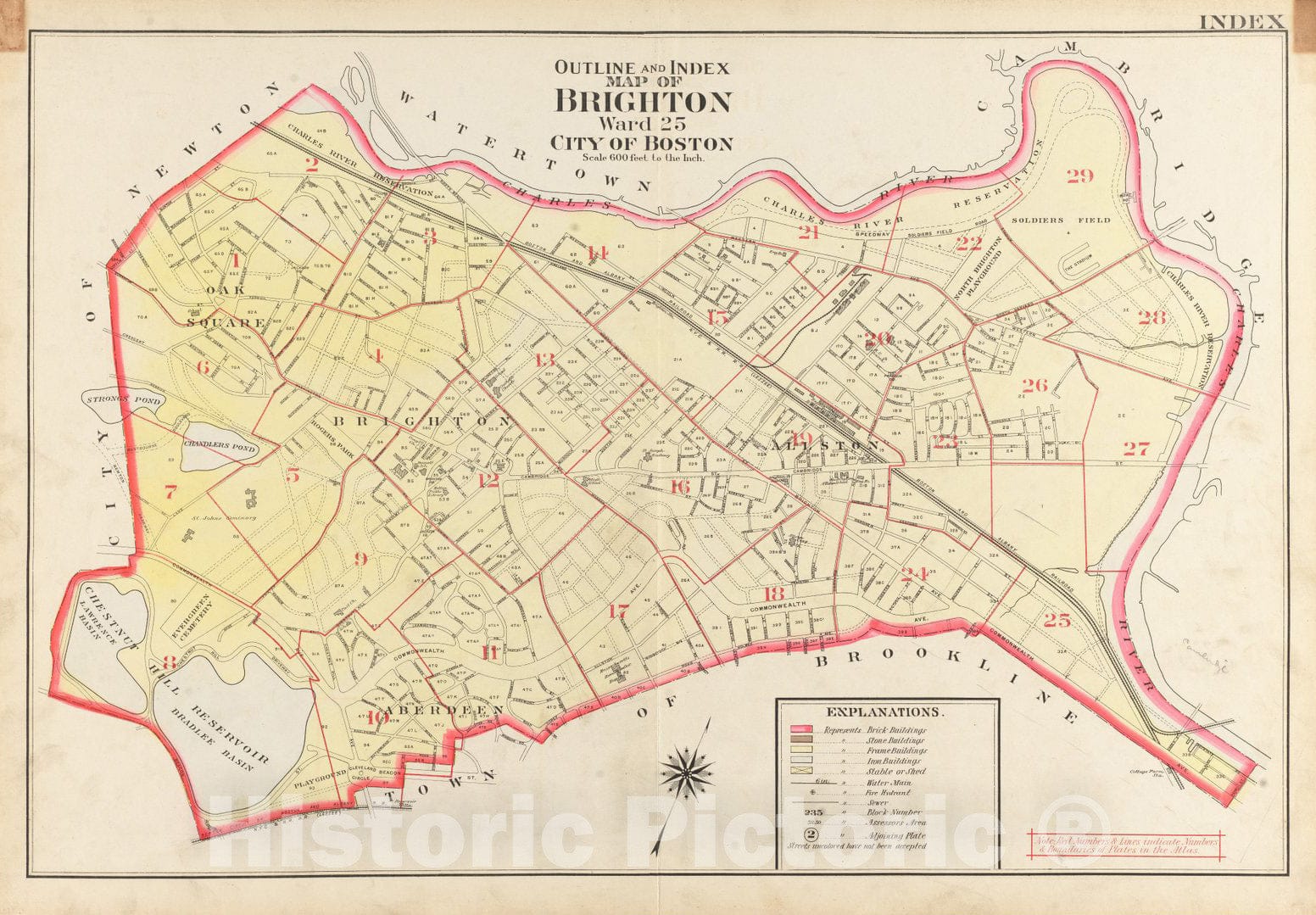 Historical Map, 1909 Outline and Index map of Brighton, Ward 25, City of Boston, Vintage Wall Art
