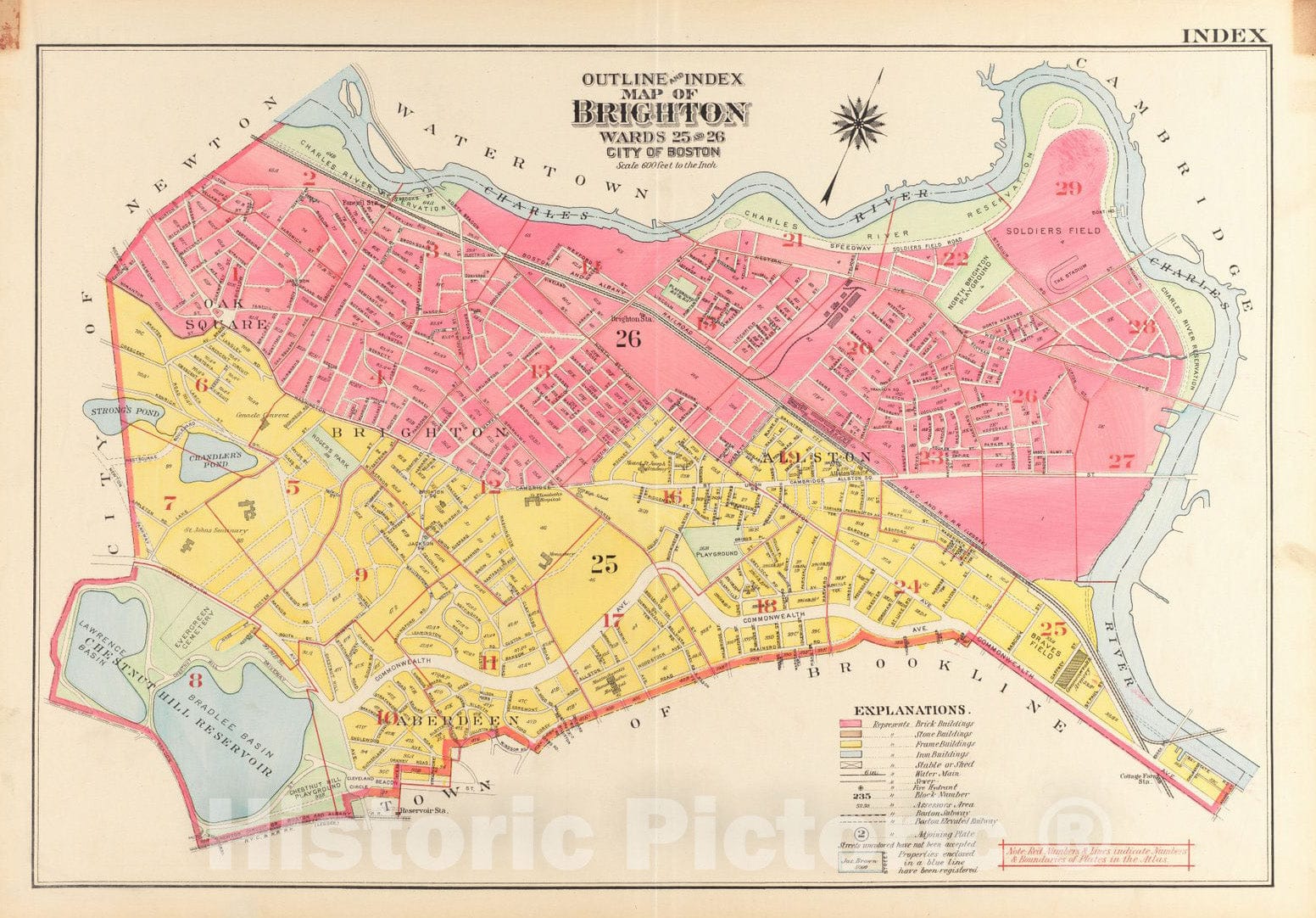 • .Historical Map, 1916 Outline and Index map of Brighton, wards 25 & 26, City of Boston, Vintage Wall Art