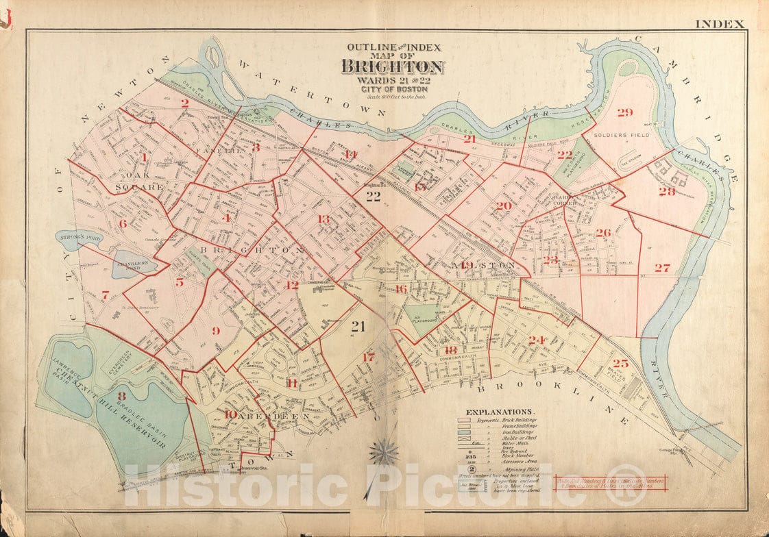 Historical Map, 1925 Outline and Index map of Brighton, wards 21 and 22, City of Boston, Vintage Wall Art